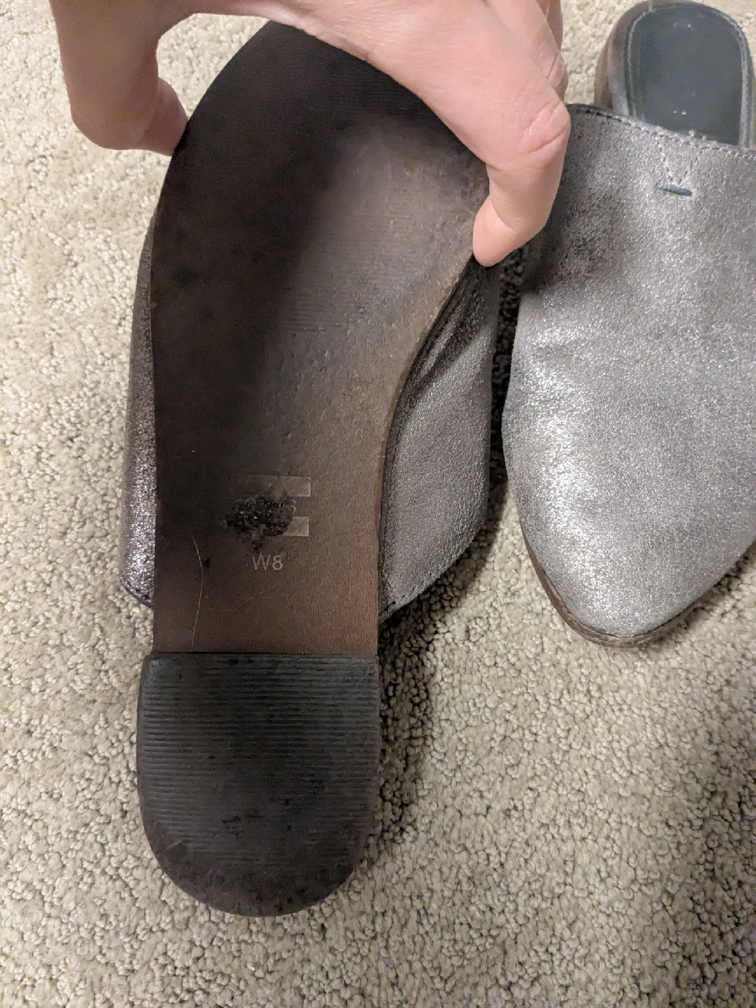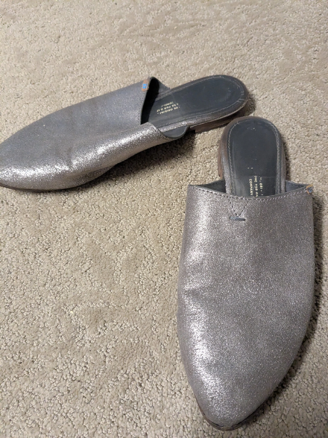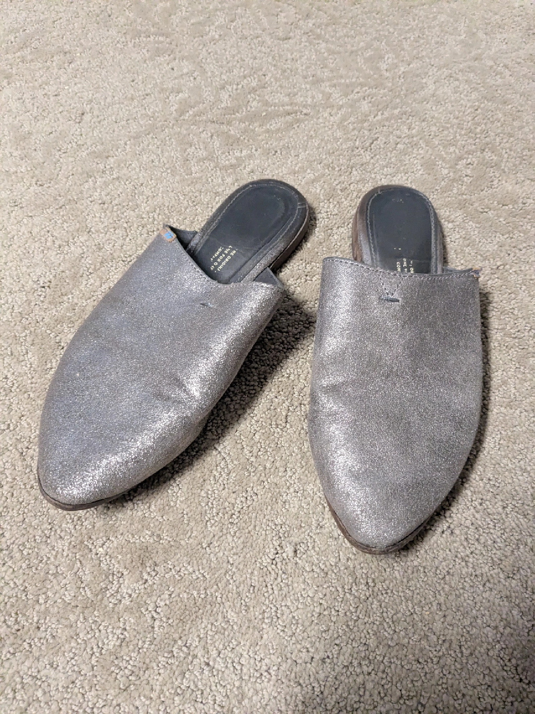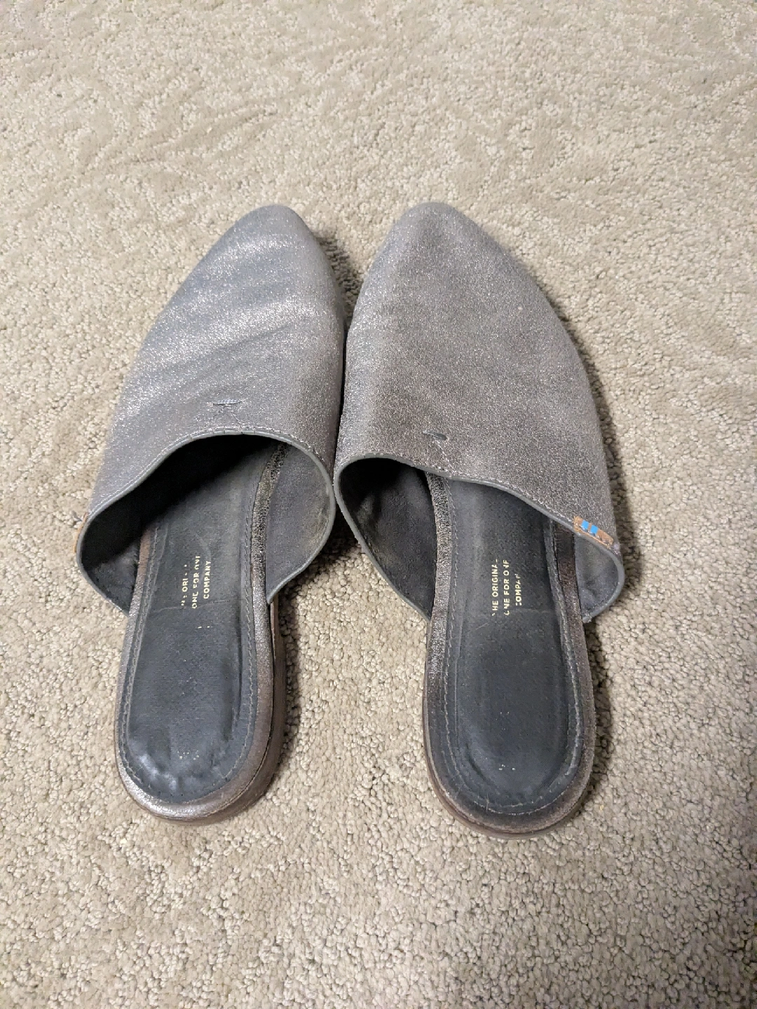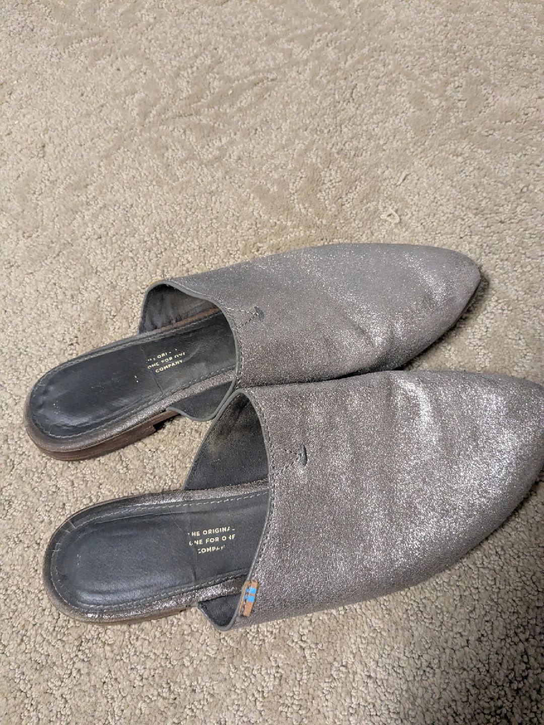Selling a pair of TOMS mules in a lovely silver colour. They are a women's size 8. These comfy mules are perfect for slipping on and heading out the door!