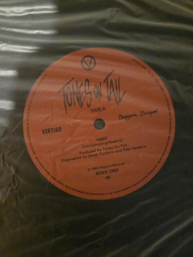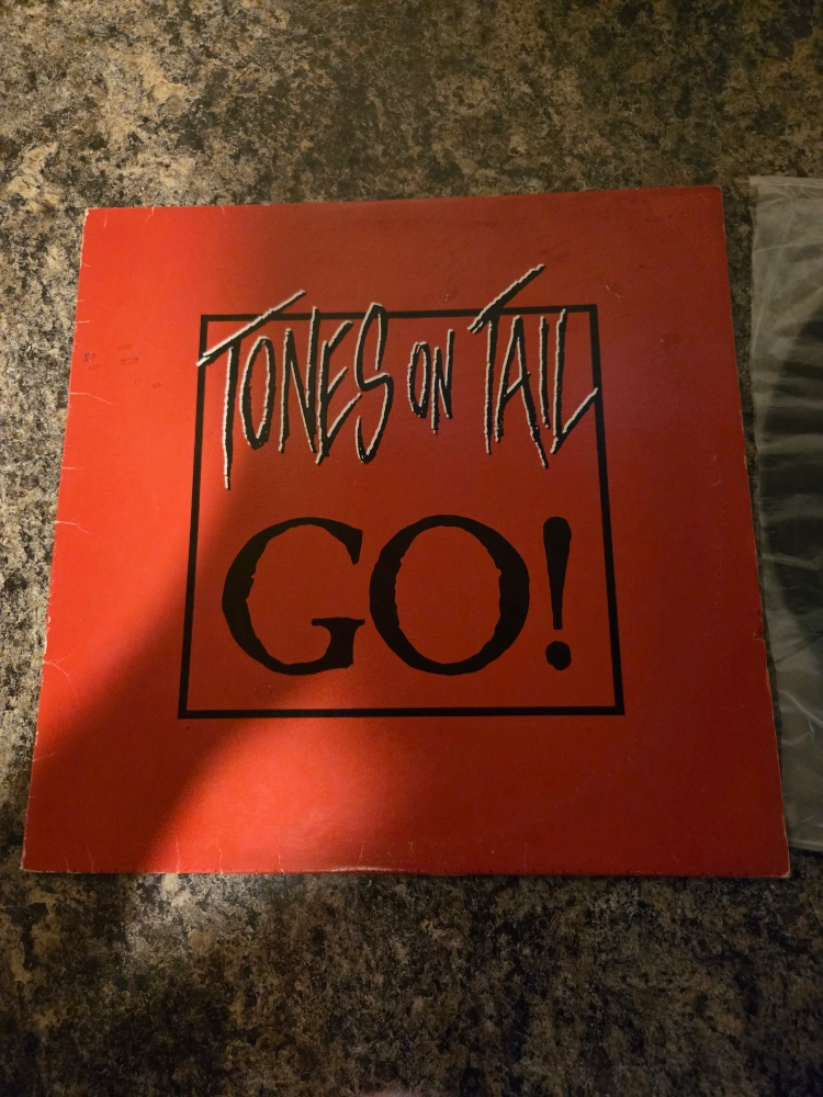 Selling a Tones on Tail vinyl record, the GO! album. The record includes the song Twist. It was released by Beggars Banquet in 1984.
