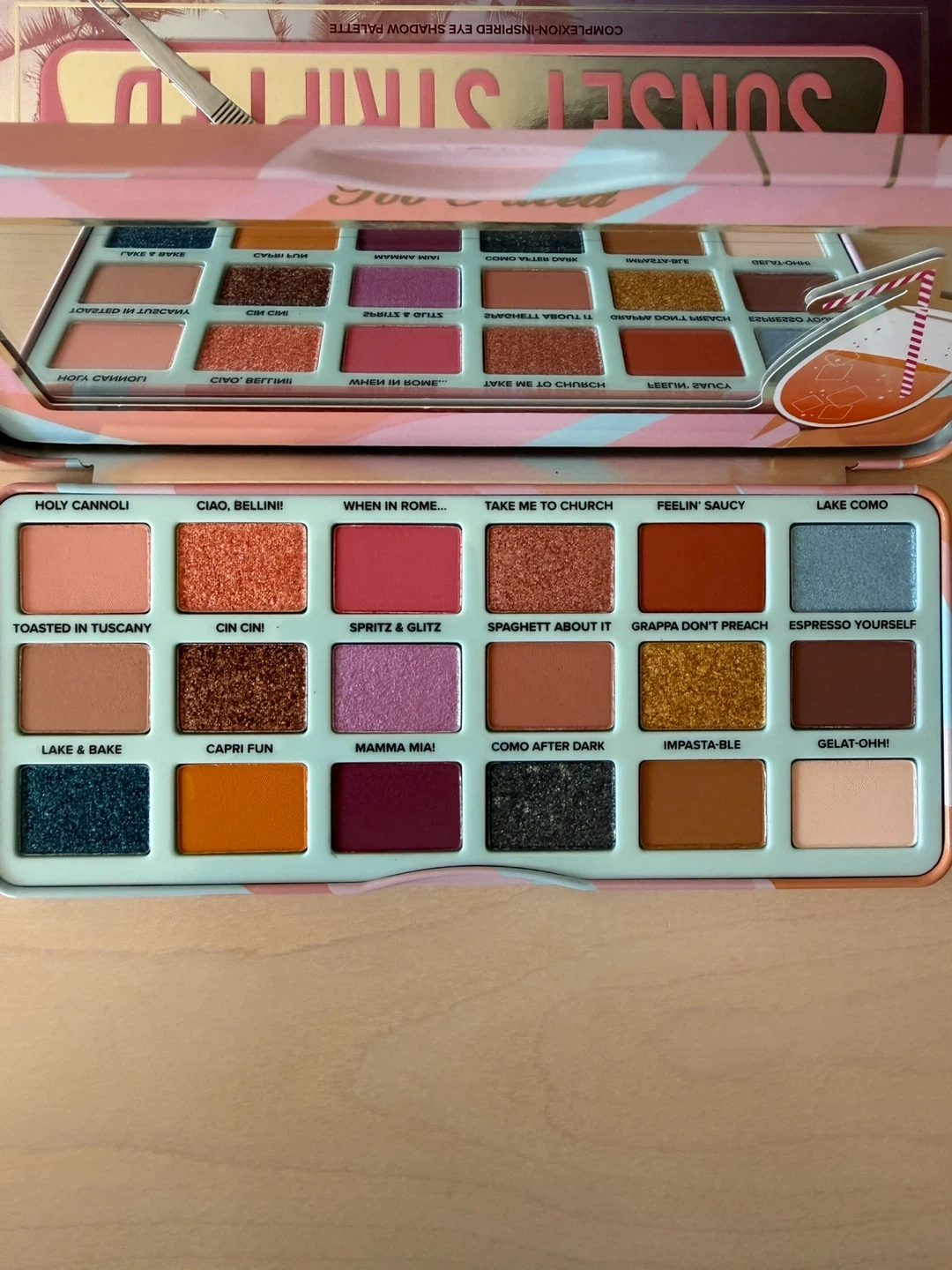Selling a Too Faced Italian Spritz eyeshadow palette! It's a Lake Como cocktail-inspired palette with a variety of shades. The palette includes shades like Holy Cannoli, Ciao Bellini, and Espresso Yourself, perfect for creating a range of looks