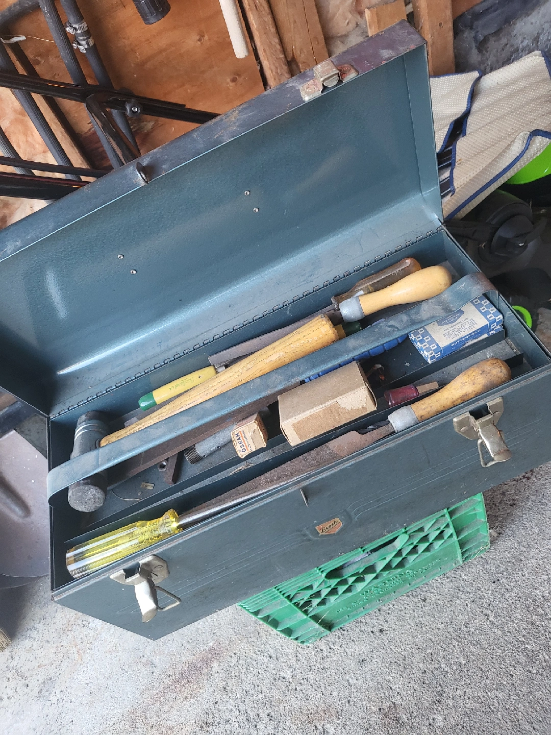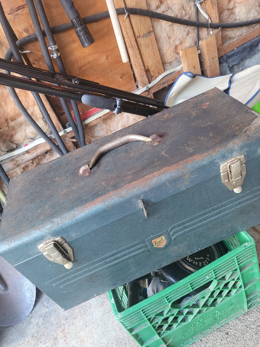 Good solid heavy duty Toolbox. Has a handle and two clasps. Perfect for storing your tools, keeping them safe and organized. Good solid tool box. Measures 20in X 9in X 9in. (Tools shown in the picture not included)