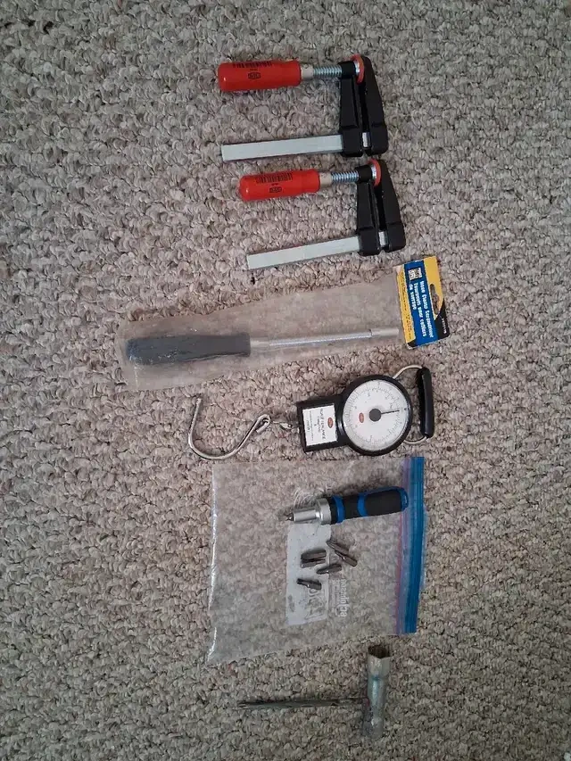 Check out this collection of tools, all in used condition! This set includes clamps, a telescoping magnet, scales, a screwdriver with bits, and a specialty wrench. Don't miss out!