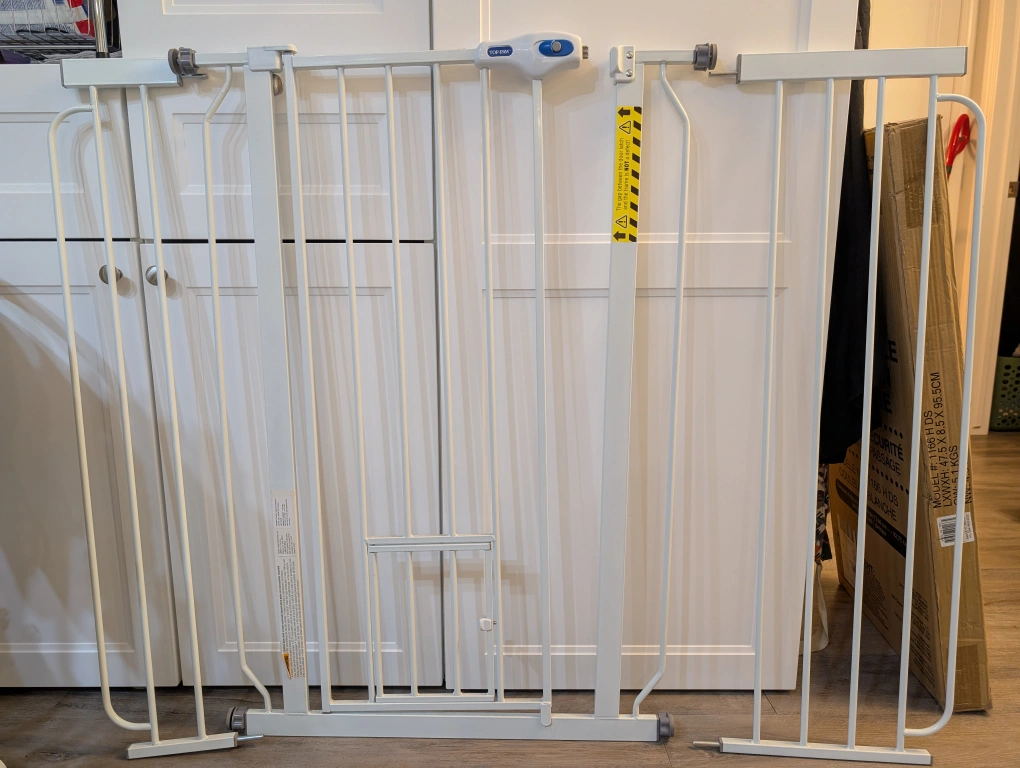 Selling a Top Paw extra tall walk-through pet/baby gate in great condition! This pressure-mounted gate is perfect for keeping your furry friends or babies safe and secure. It fits openings from 29" to 36" wide and stands 41" tall (73.6-127x 104 cm). The gate also features a small pet door, so cats can easily pass through. $100 OBO, delivery available for a fee.