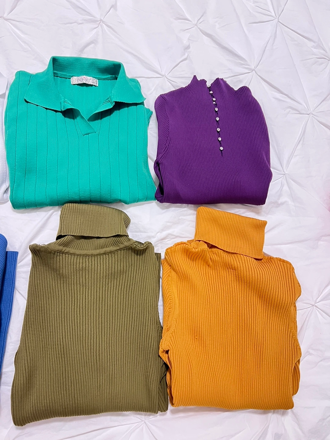 Selling a variety of knit tops. Great for layering or wearing on their own. The colors include white, orange, blue, green, purple, olive, and yellow. All are in good condition and ready for a new home
