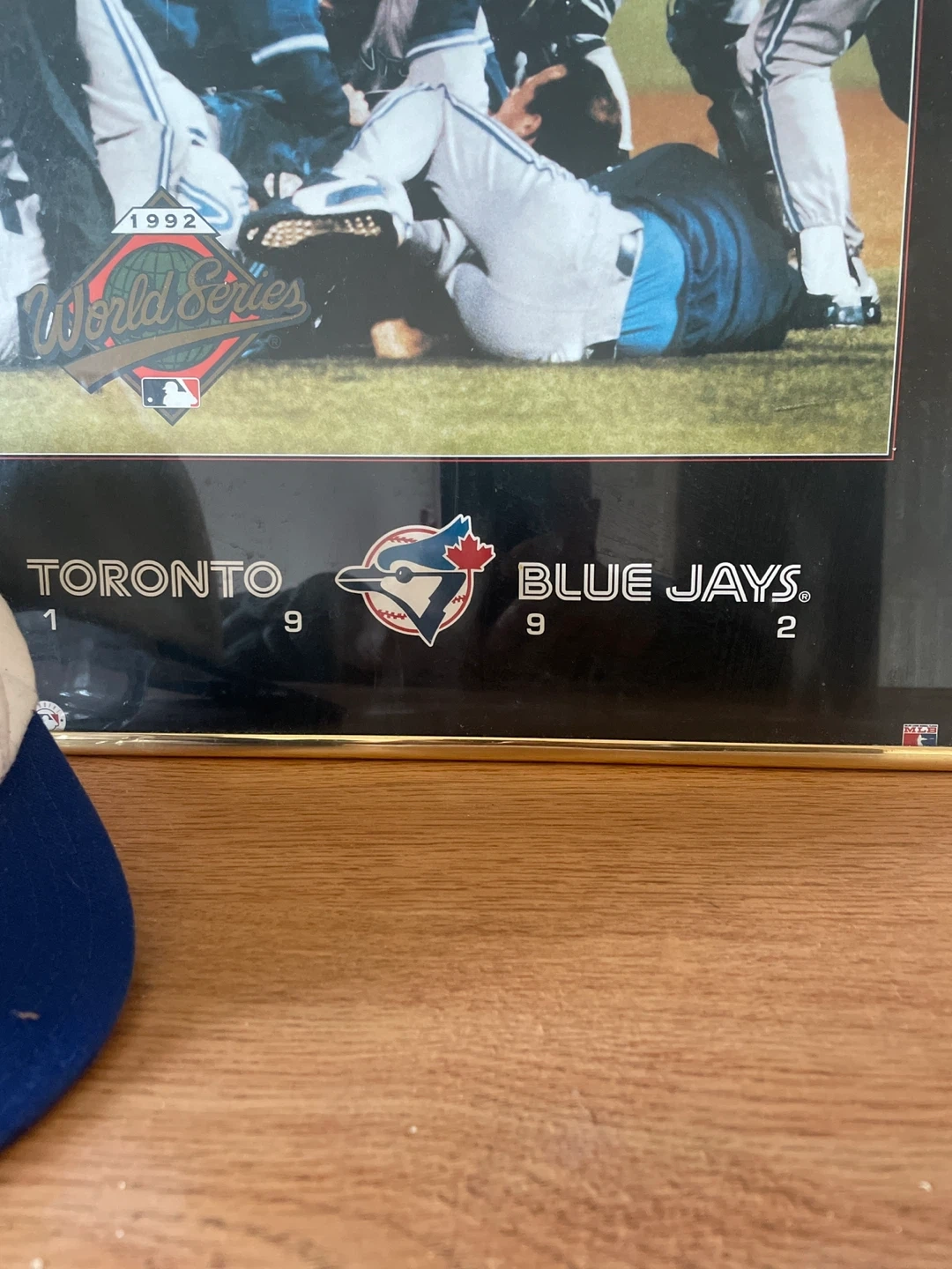 Selling a Toronto Blue Jays 1992 World Series poster in a frame, along with a matching hat! Both items commemorate the Blue Jays' World Series win in 1992. Perfect for any Jays fan!