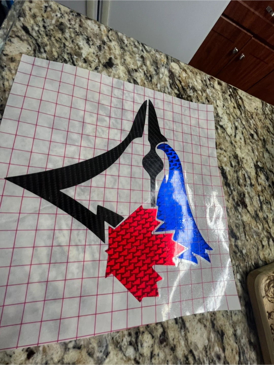Selling a Toronto Blue Jays decal! It features a carbon fiber design in black, blue, and red. Perfect for showing your team spirit!
