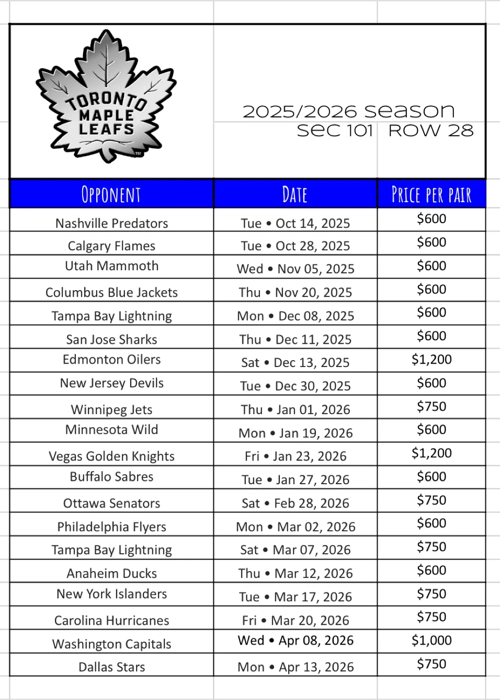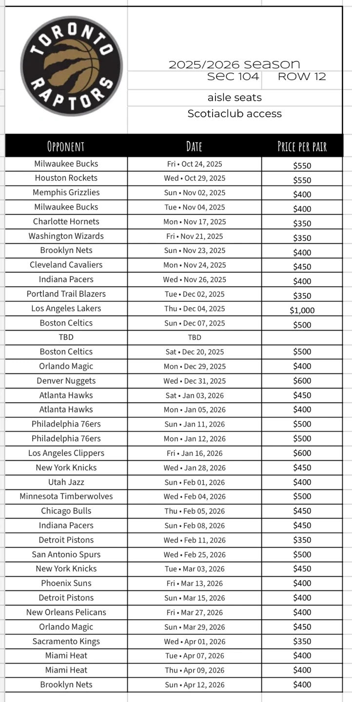 Selling my tickets for the upcoming 2025/2026 season! I have season tickets for both the Toronto Maple Leafs and the Toronto Raptors. See images for seat info, dates, and prices per pair. Toronto Raptors: 2025/2026 Season, Section 104, Row 12, aisle seats, ScotiaClub access Toronto Maple Leafs: 2025/2026 Season, Section 101, Row 28, ScotiaClub Access Can meet anywhere in Clarington.