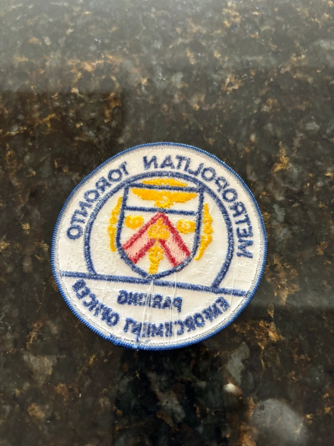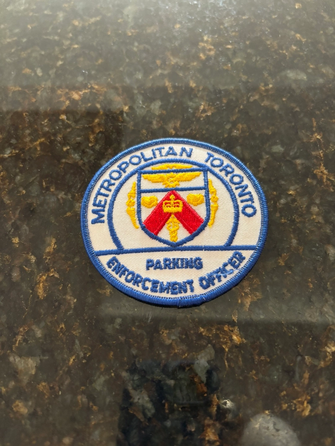 Circular embroidered patch. Features Toronto Metropolitan Parking Enforcement Officer text. Shows a crest. Collectible item. Brand new. From a pet and smoke free home. Pickup only in the St. Lawrence market area of downtown Toronto. Cash only.