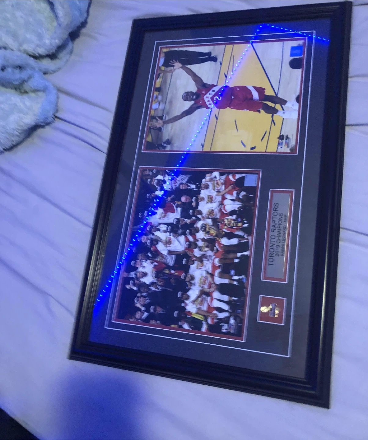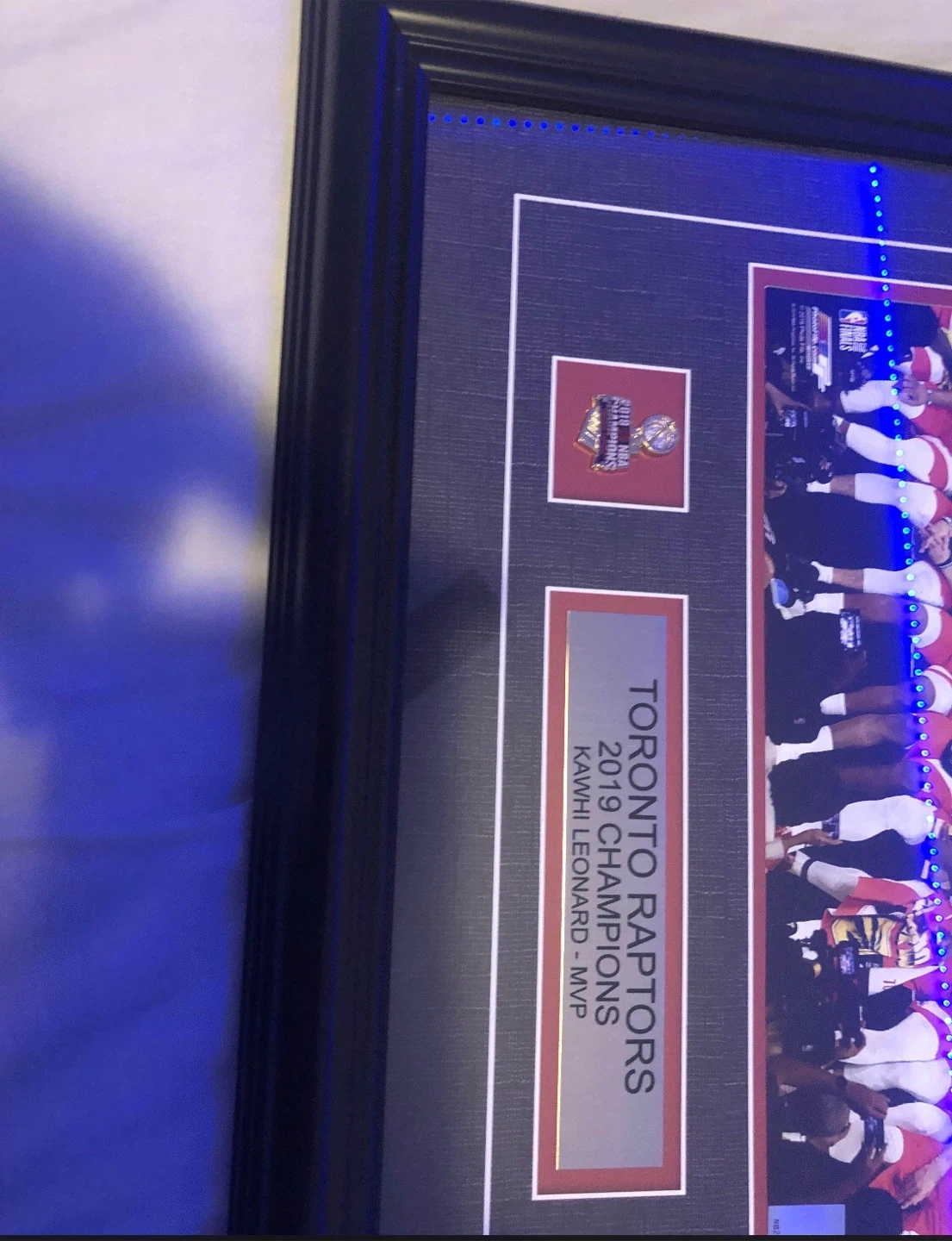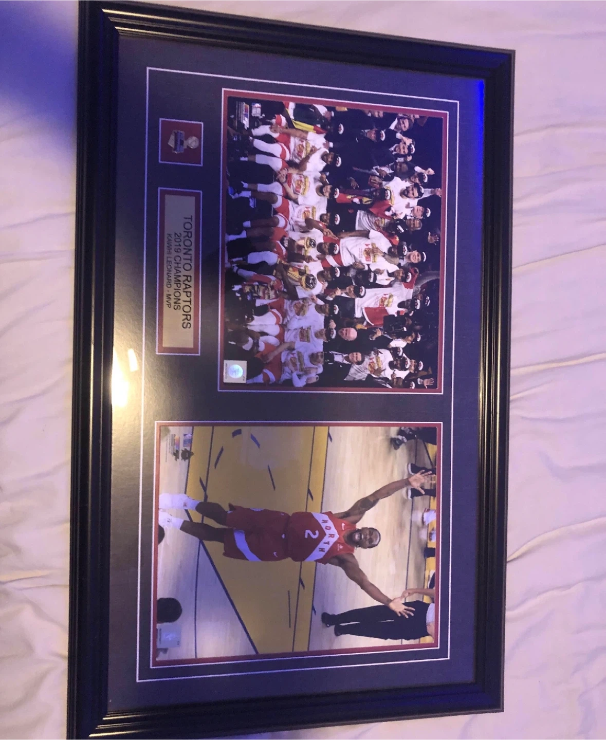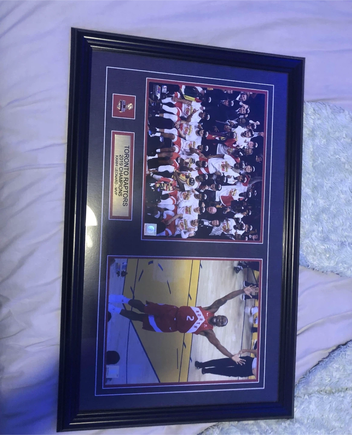 Selling a framed photo collage celebrating the Toronto Raptors' 2019 championship win! It features images of Kawhi Leonard and the team celebrating. A great piece for any Raptors fan!