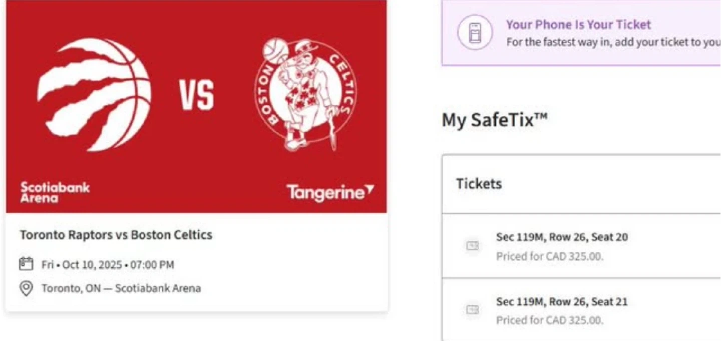 Selling two tickets to see the Toronto Raptors play the Boston Celtics at Scotiabank Arena on Friday, October 10, 2025 at 7:00 PM! The seats are in Sec 119M, Row 26, Seats 20 and 21 $275 each or best