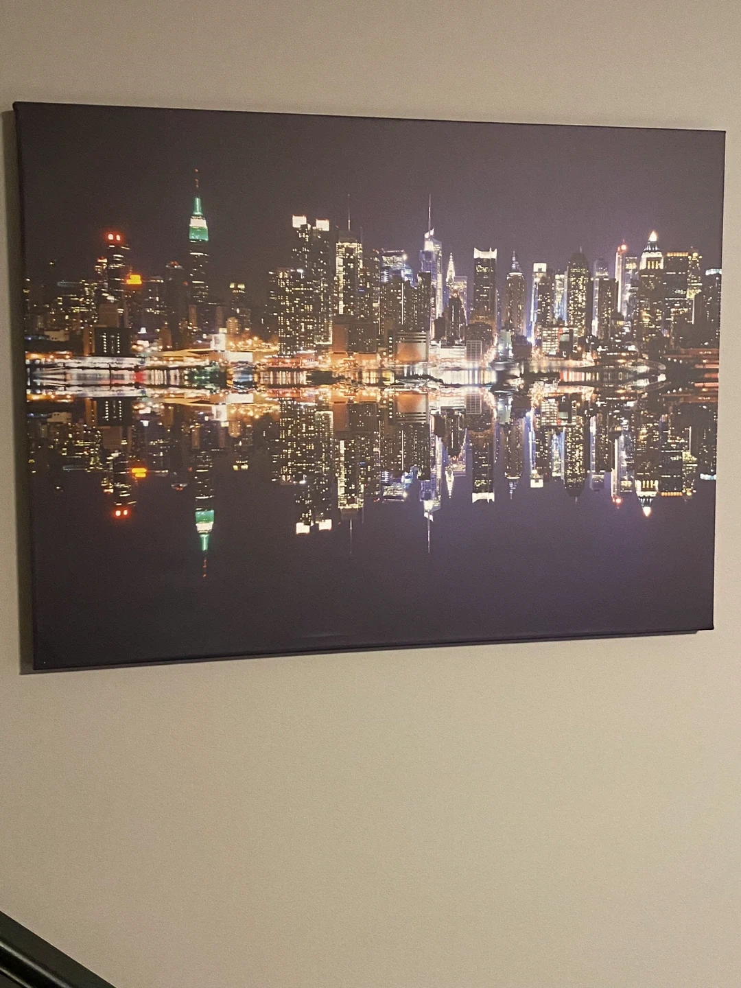 Canvas wall art featuring a cityscape at night, with the city lights reflecting in the water. It's in great condition and would look lovely in any room Toronto skyline! Redecorating just doesn’t match paid $175.00 new.