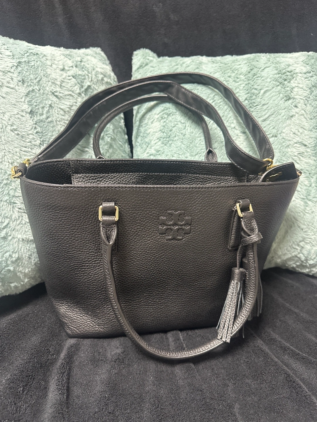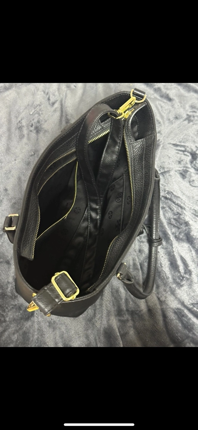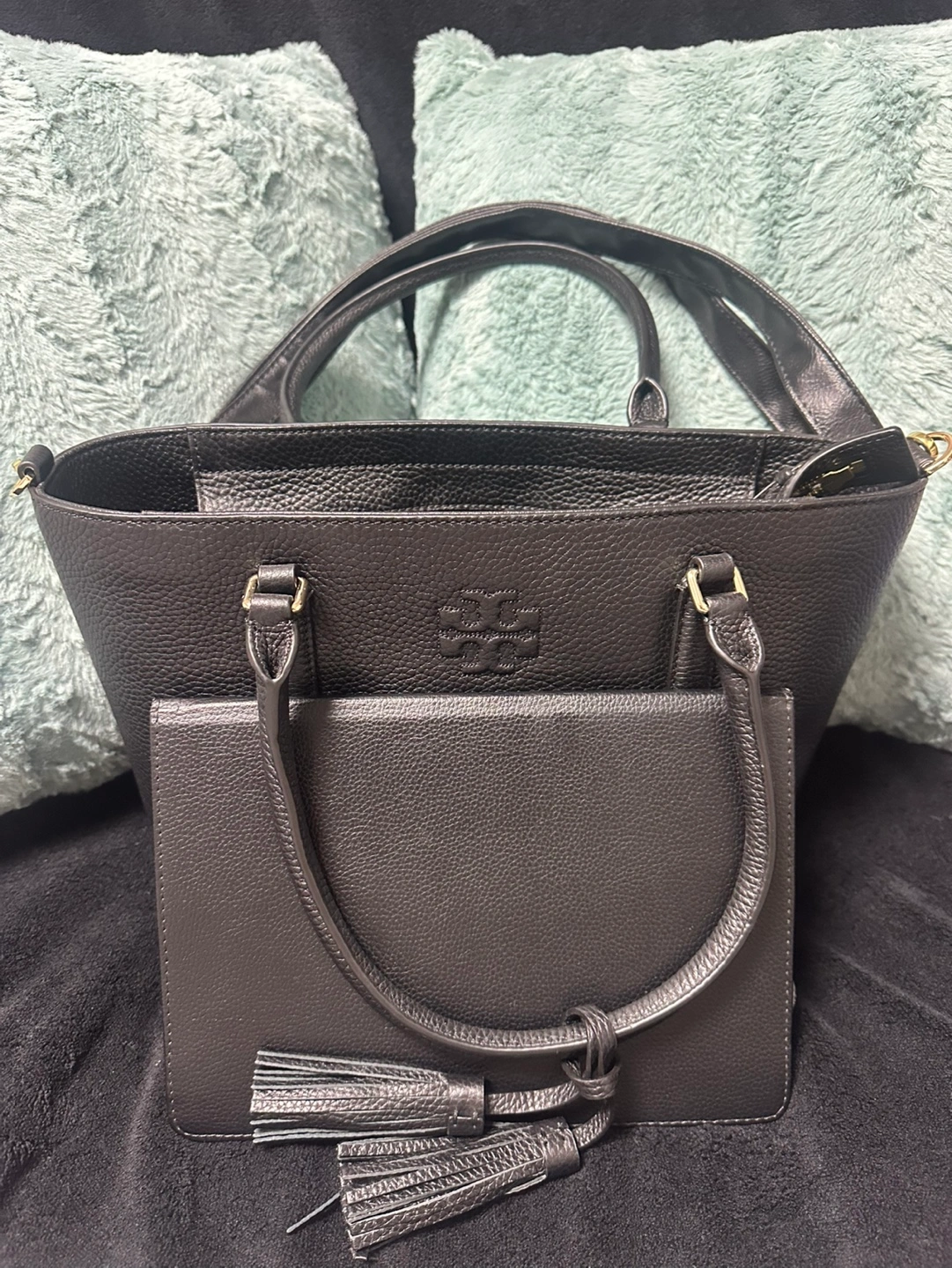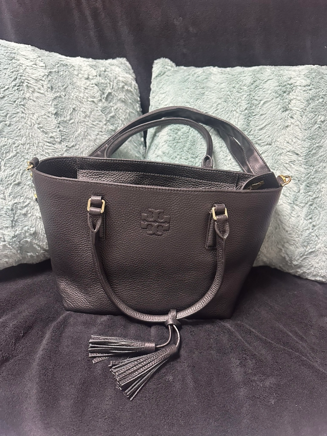 Beautiful black leather tote bag. Features a detachable pouch with a tassel. Gold hardware accents. Interior is lined.