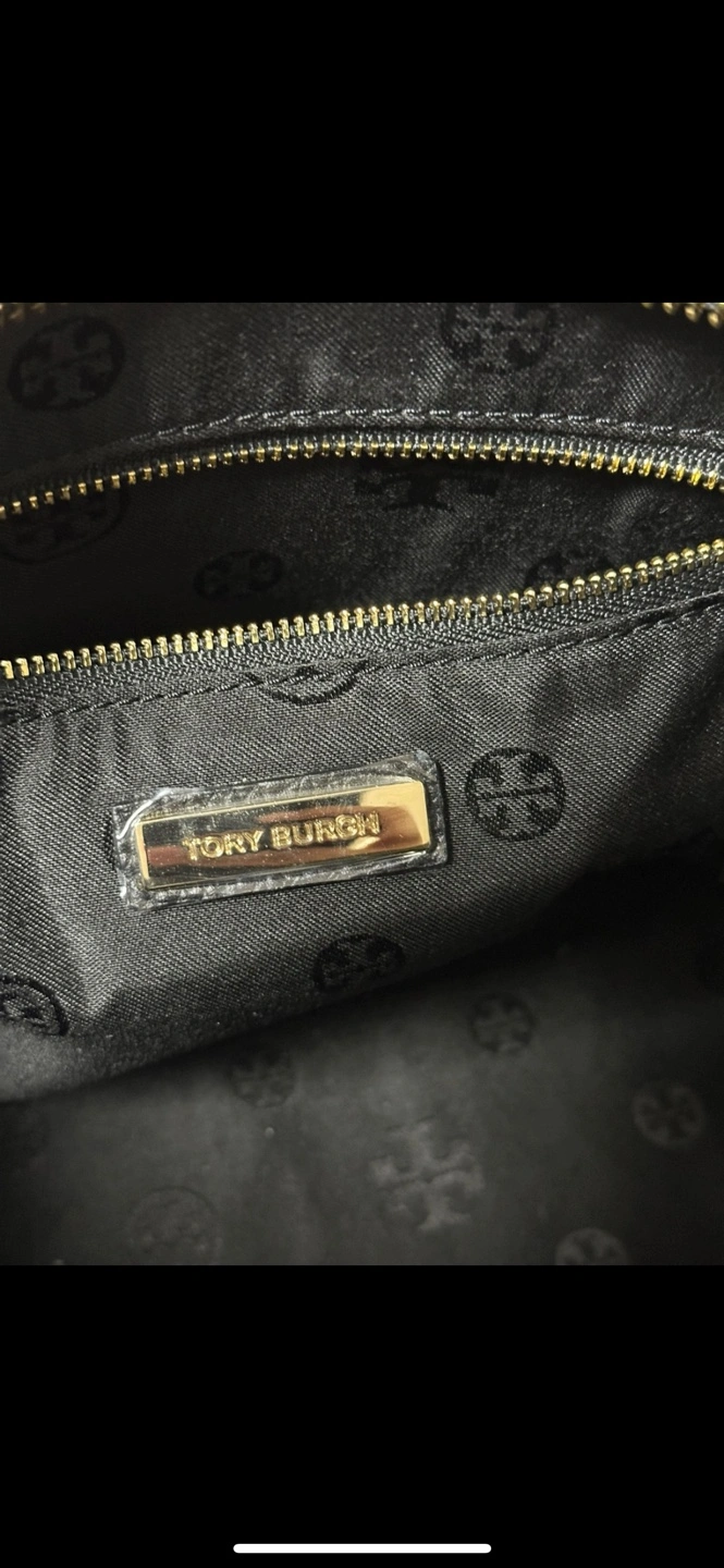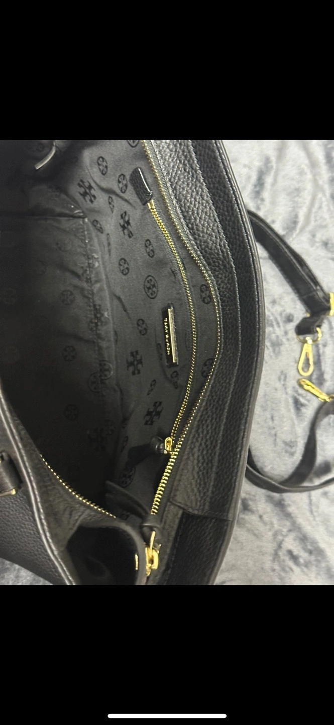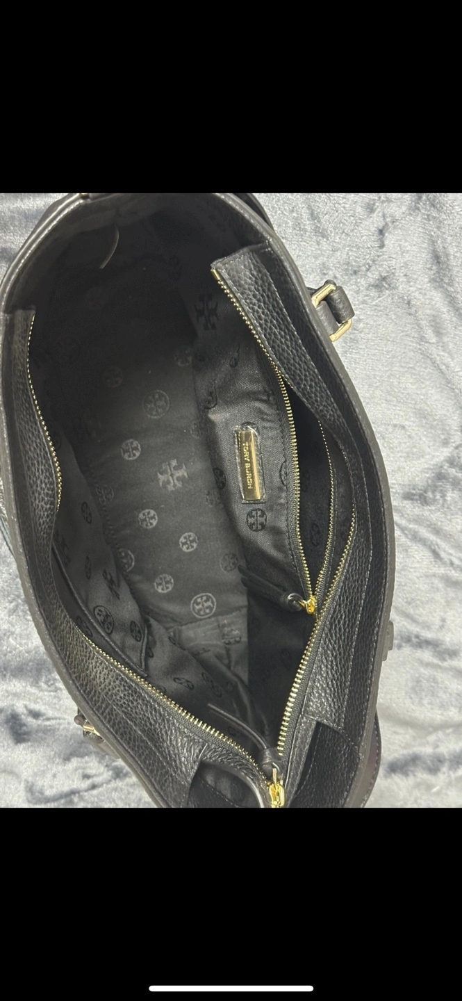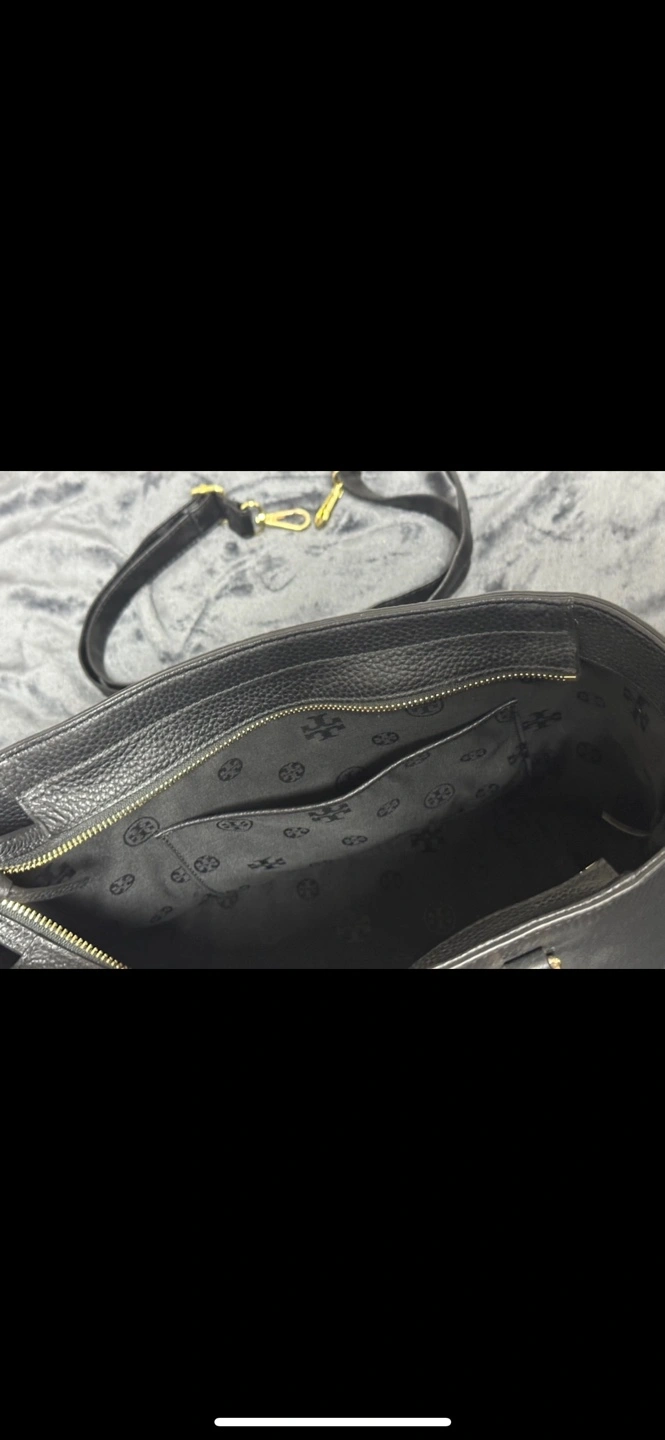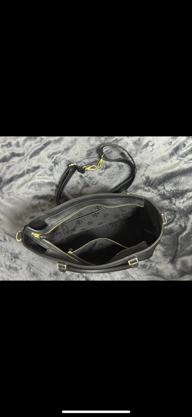 Beautiful black leather tote bag. Features a detachable pouch with a tassel. Gold hardware accents. Interior is lined.