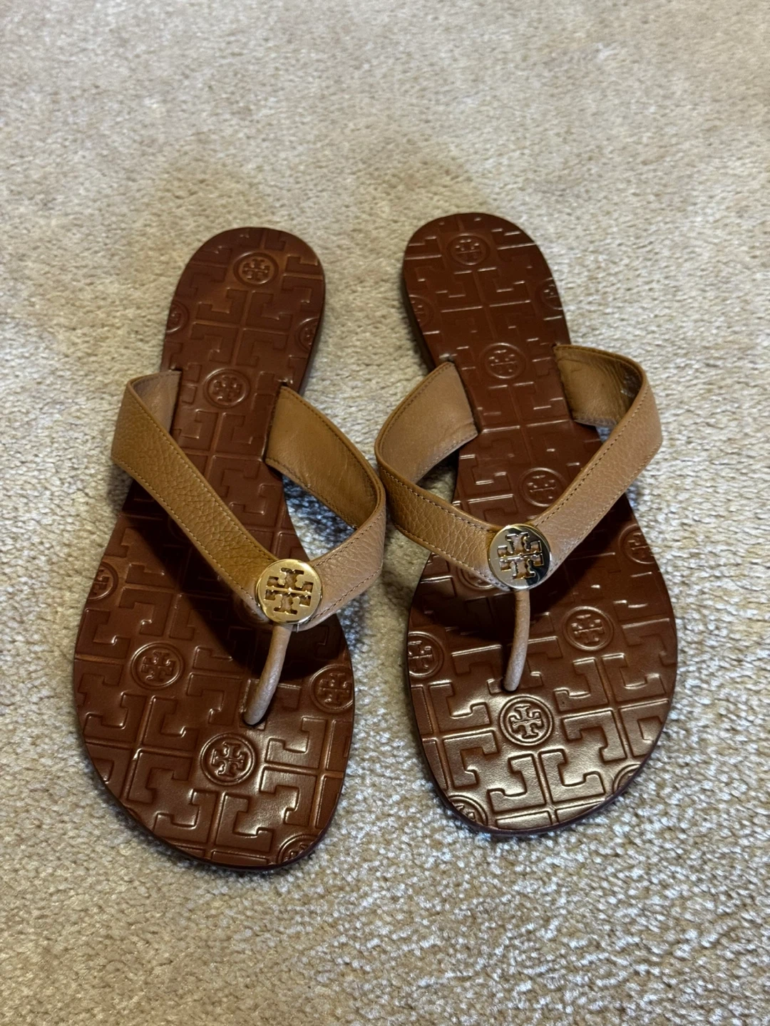 Selling a pair of Tory Burch flip flops in a lovely brown leather. They're a size 8 and have the iconic Tory Burch logo. There are some signs of wear on the soles, but they're still in good condition for everyday wear! PICKUP in Cranston SE. No Delivery