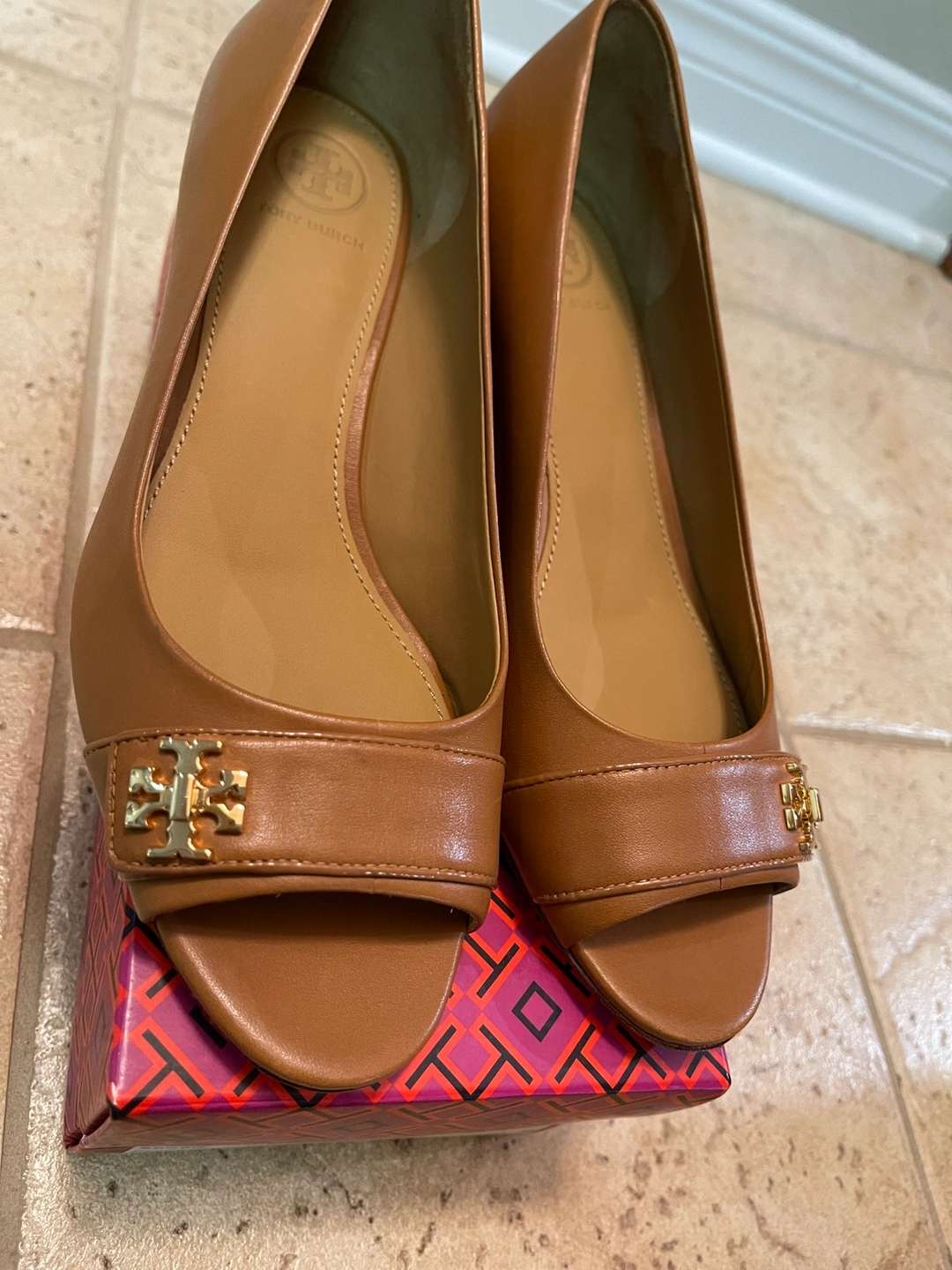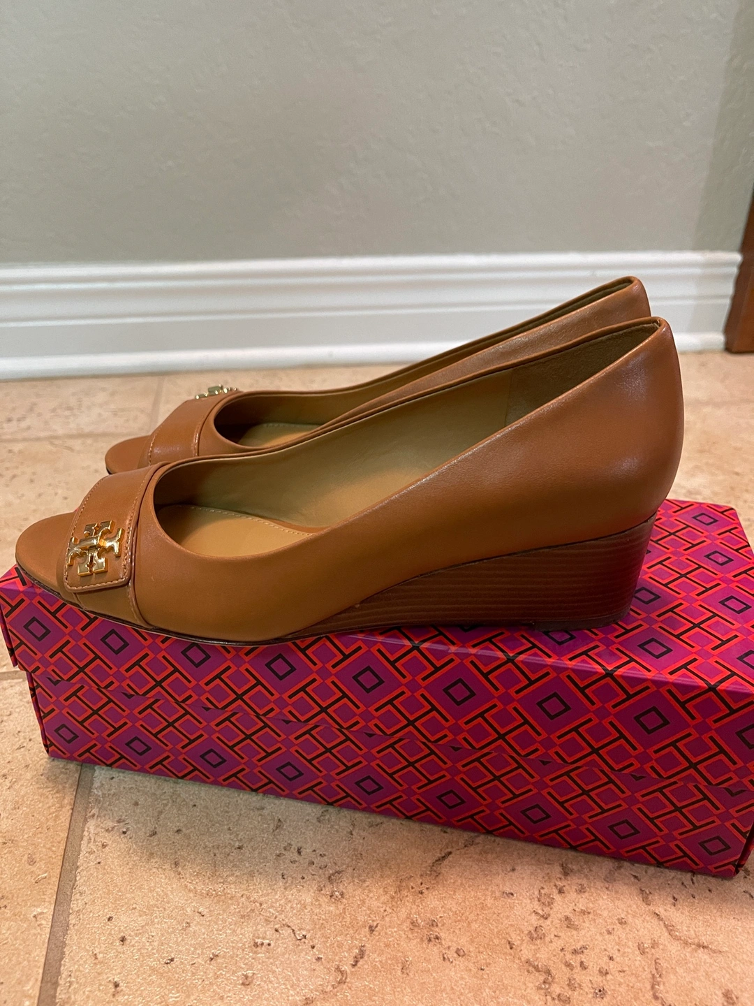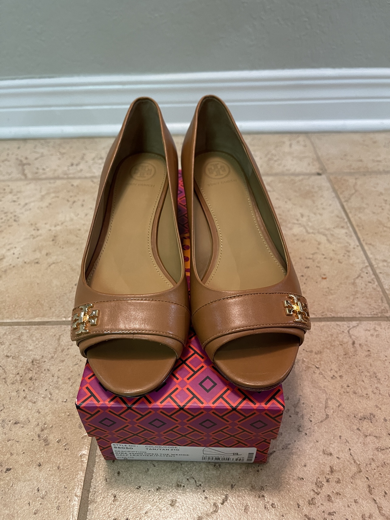 Women's size 8 brown leather peep-toe wedges with a gold logo detail.