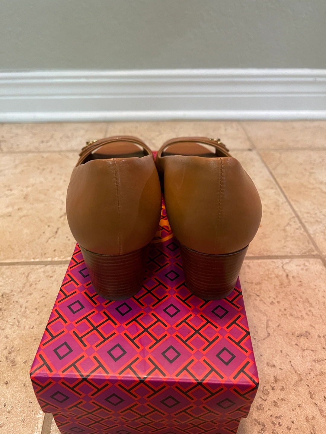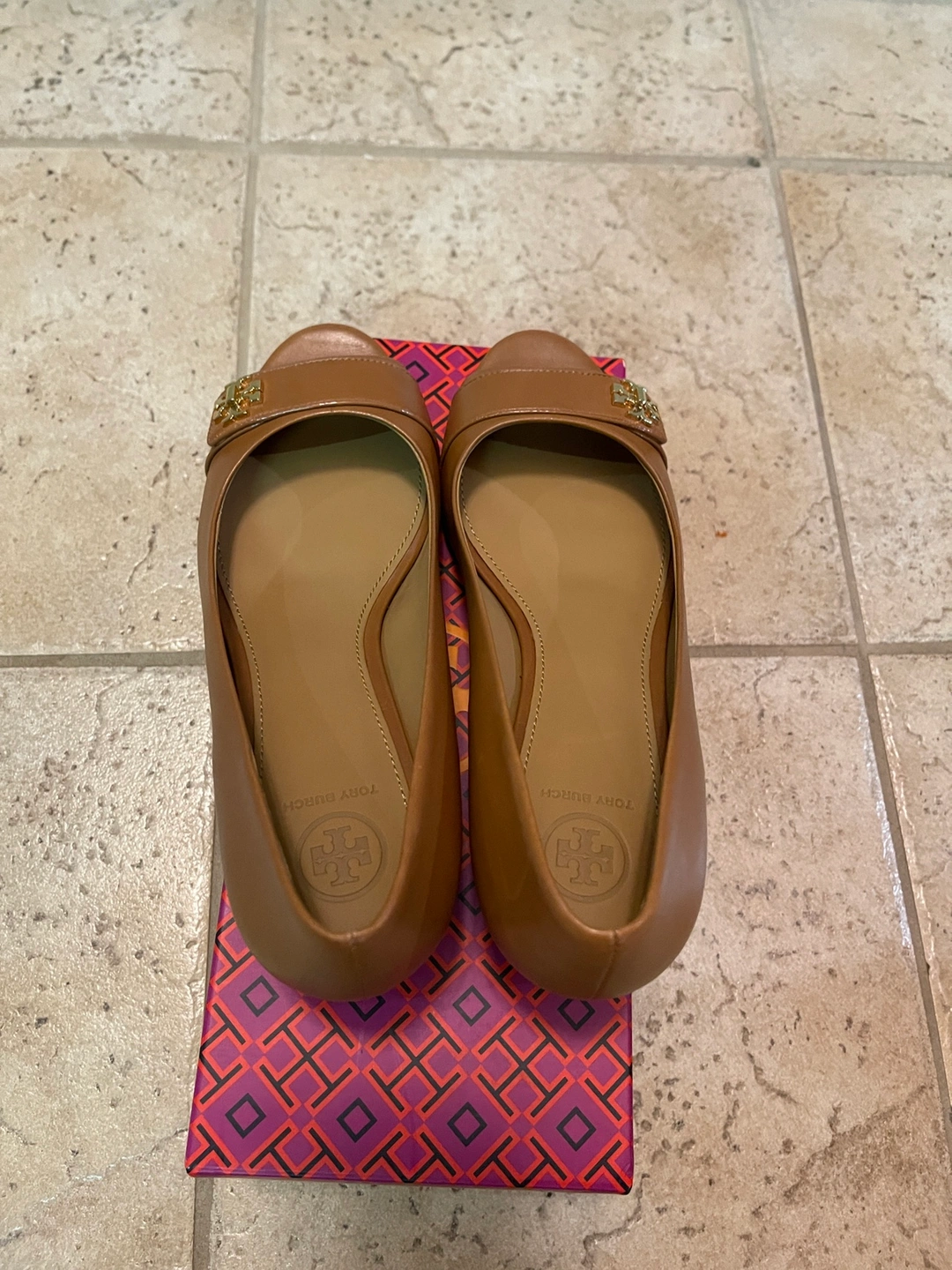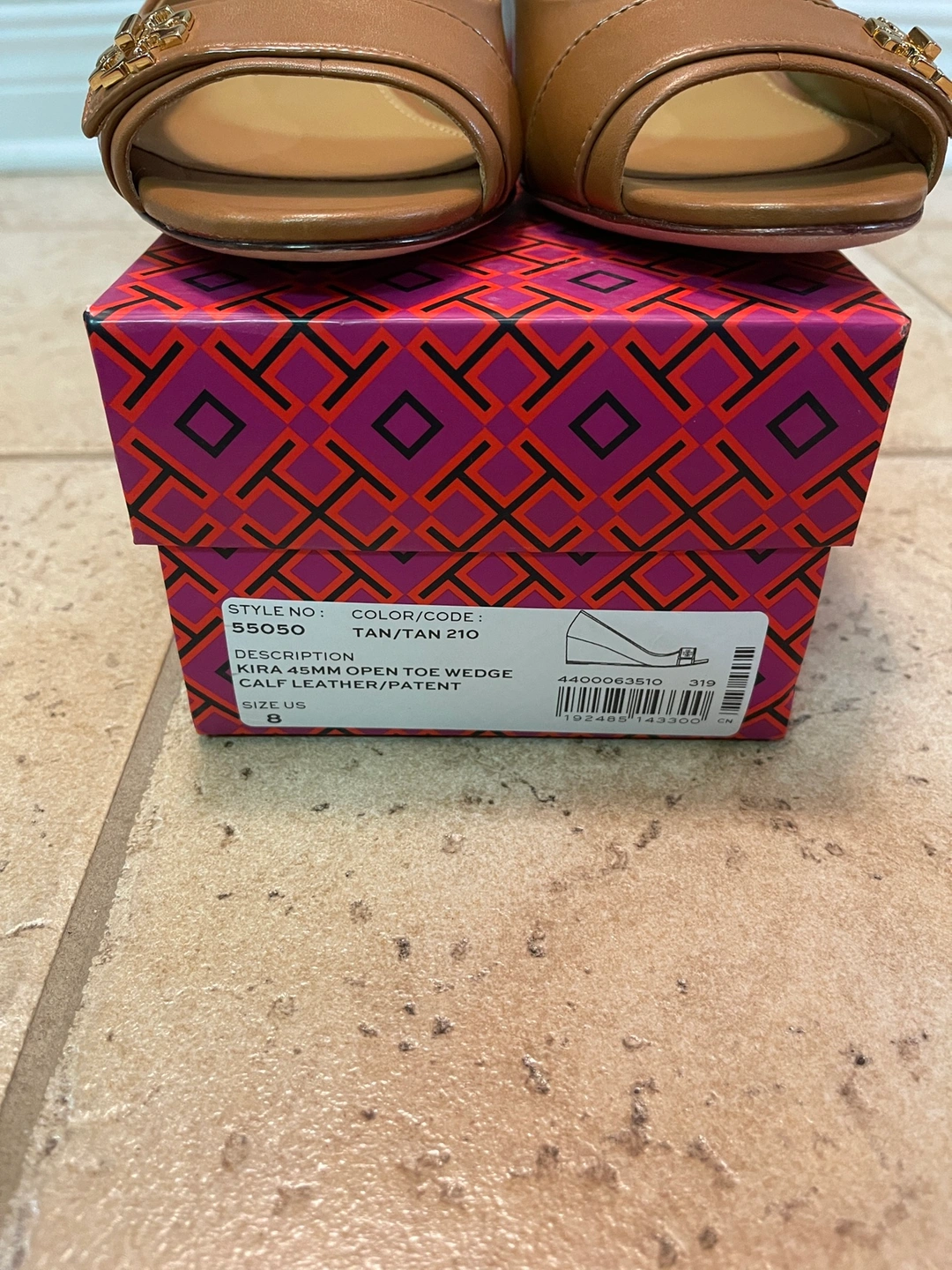 Women's size 8 brown leather peep-toe wedges with a gold logo detail.