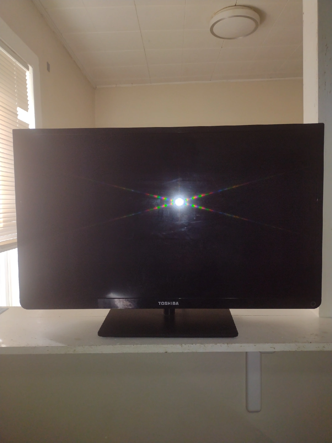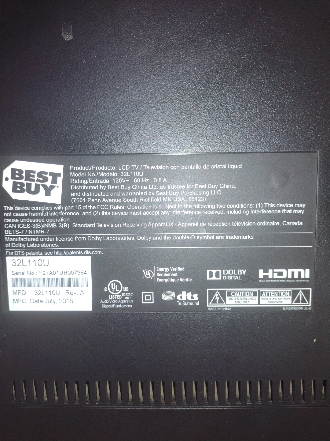 Selling a Toshiba 32L110U 32-inch LCD TV. It has a variety of inputs including digital optical audio output, Y/Video, component in, L-Audio-R, and ANT/Cable in. There are also HDMI and USB ports available. Manufacturing date is July 2015. No remote, but it works like new. Asking $50, but I'm open to offers.
