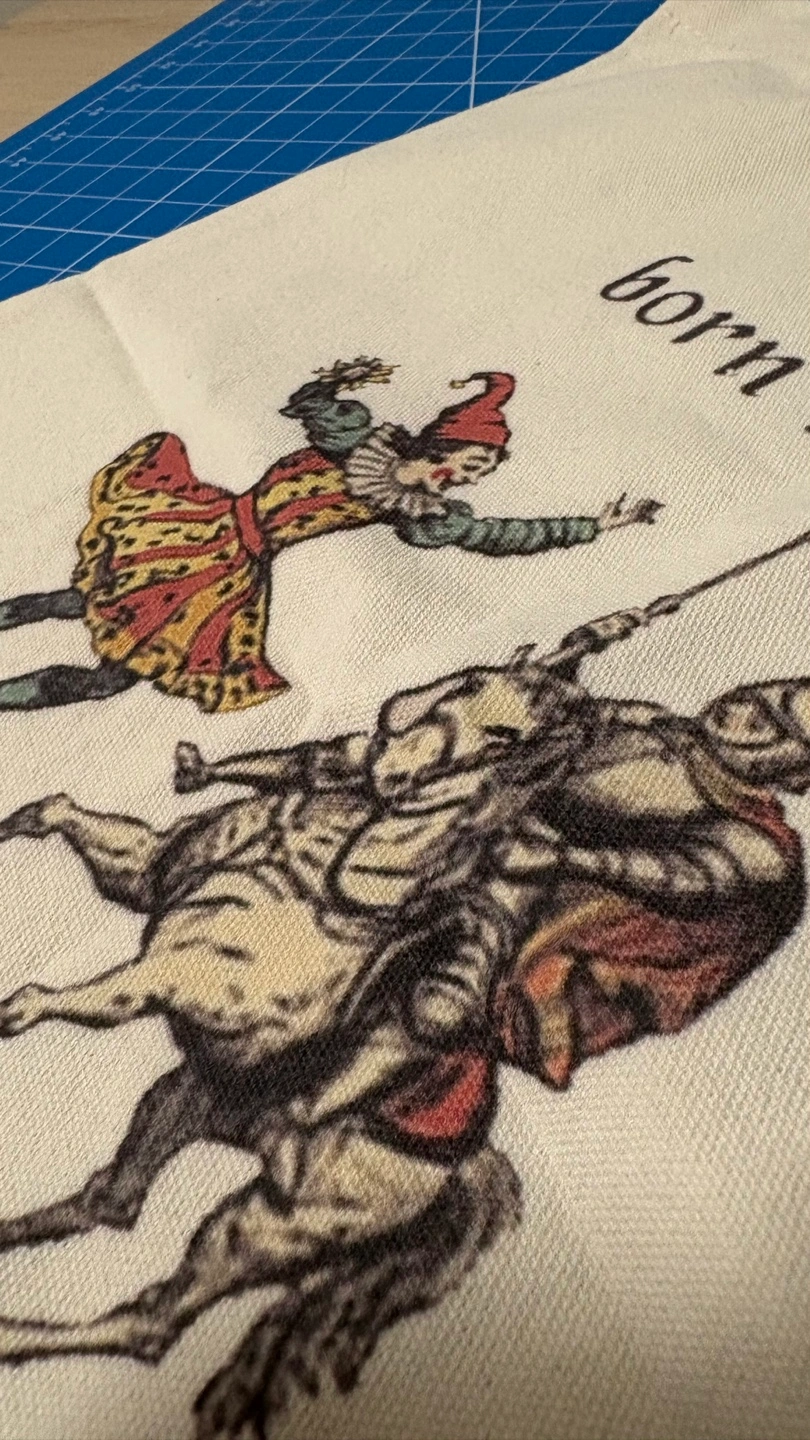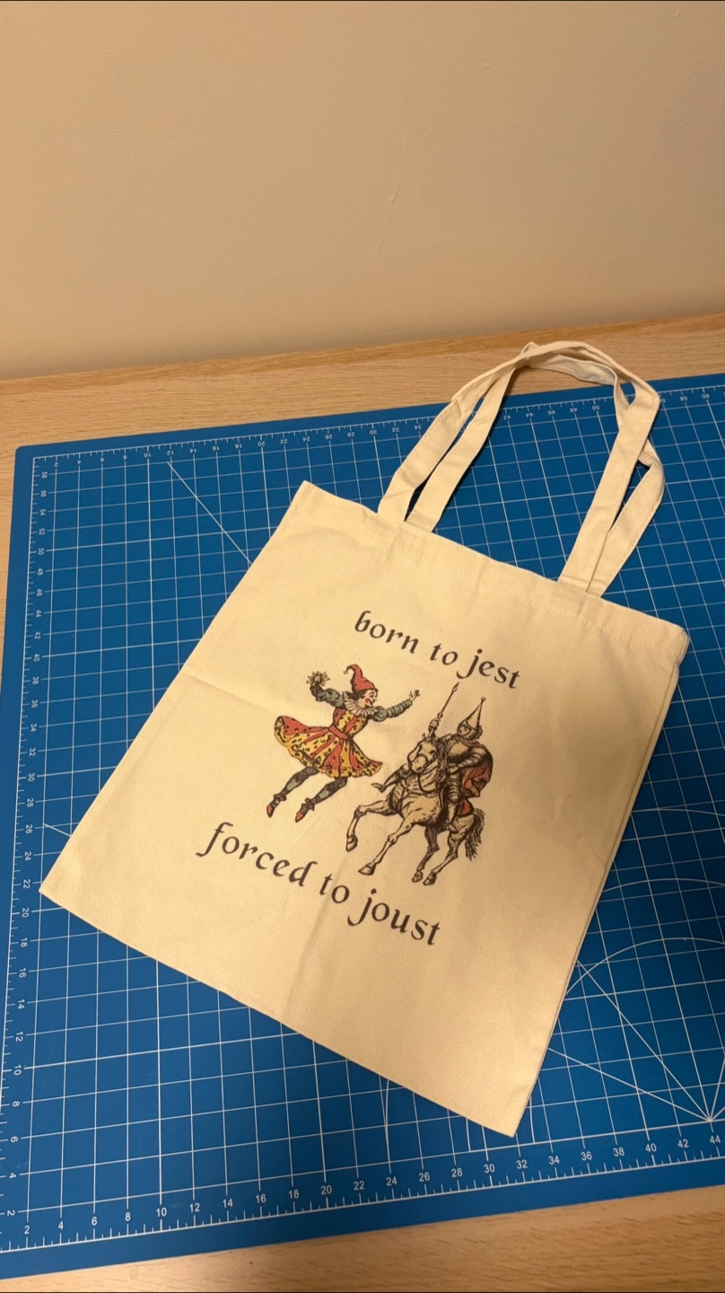 This tote bag features a fun design with the phrase 'born to jest, forced to joust' and a colourful illustration. It's a great size for carrying books, groceries, or anything else you need for the day! The material seems durable and the print is in good condition