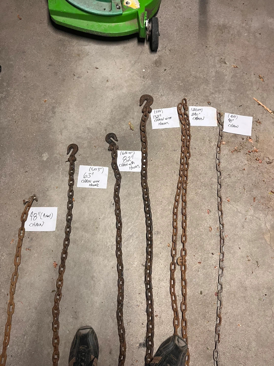 Various Tow Chains and other Chain. Tow Chain with Hooks( 5ft 3”) 63” . Tow Chain with hooks ( 6ft 10”) 82”. Tow Chain with hooks ( 11ft) 132”. Chain ( 20ft) 240”. Chain (4ft) 48”. Chain (4ft) 48” . 6 Chains total. All for one price.