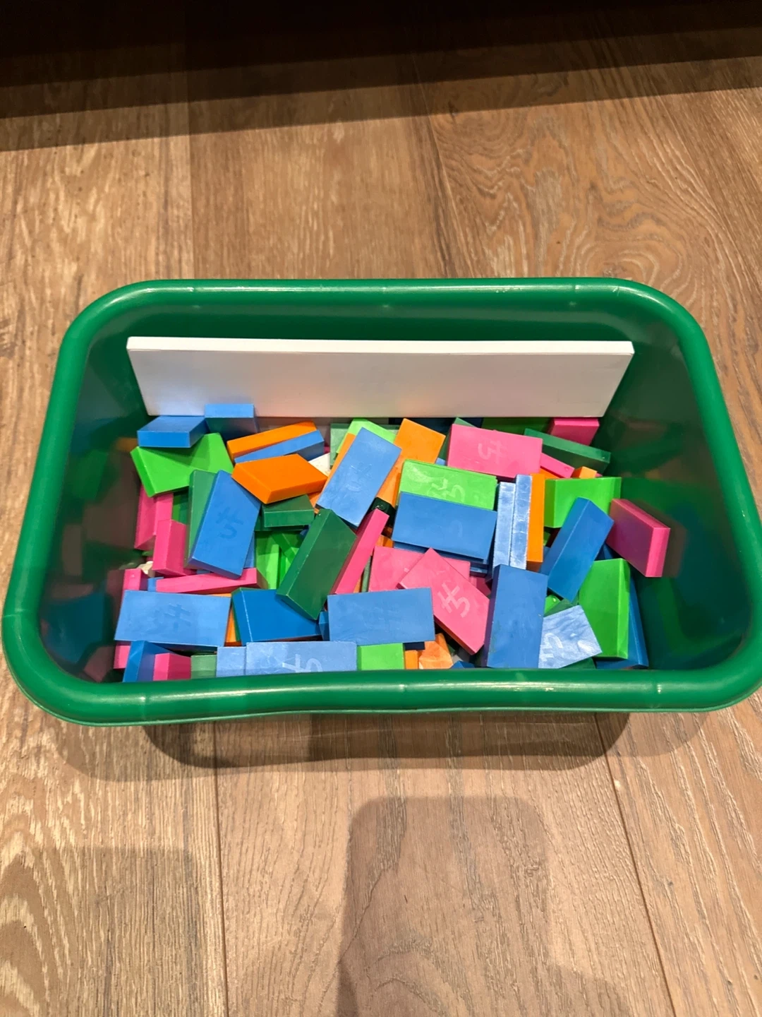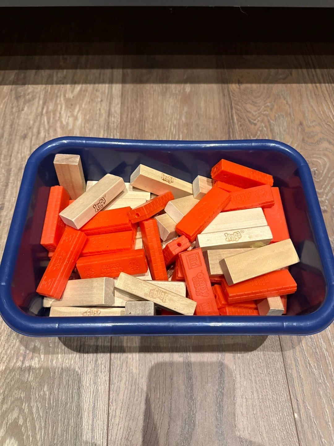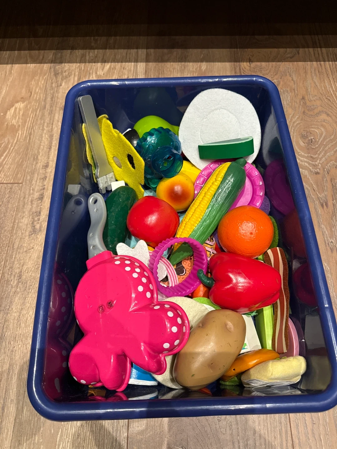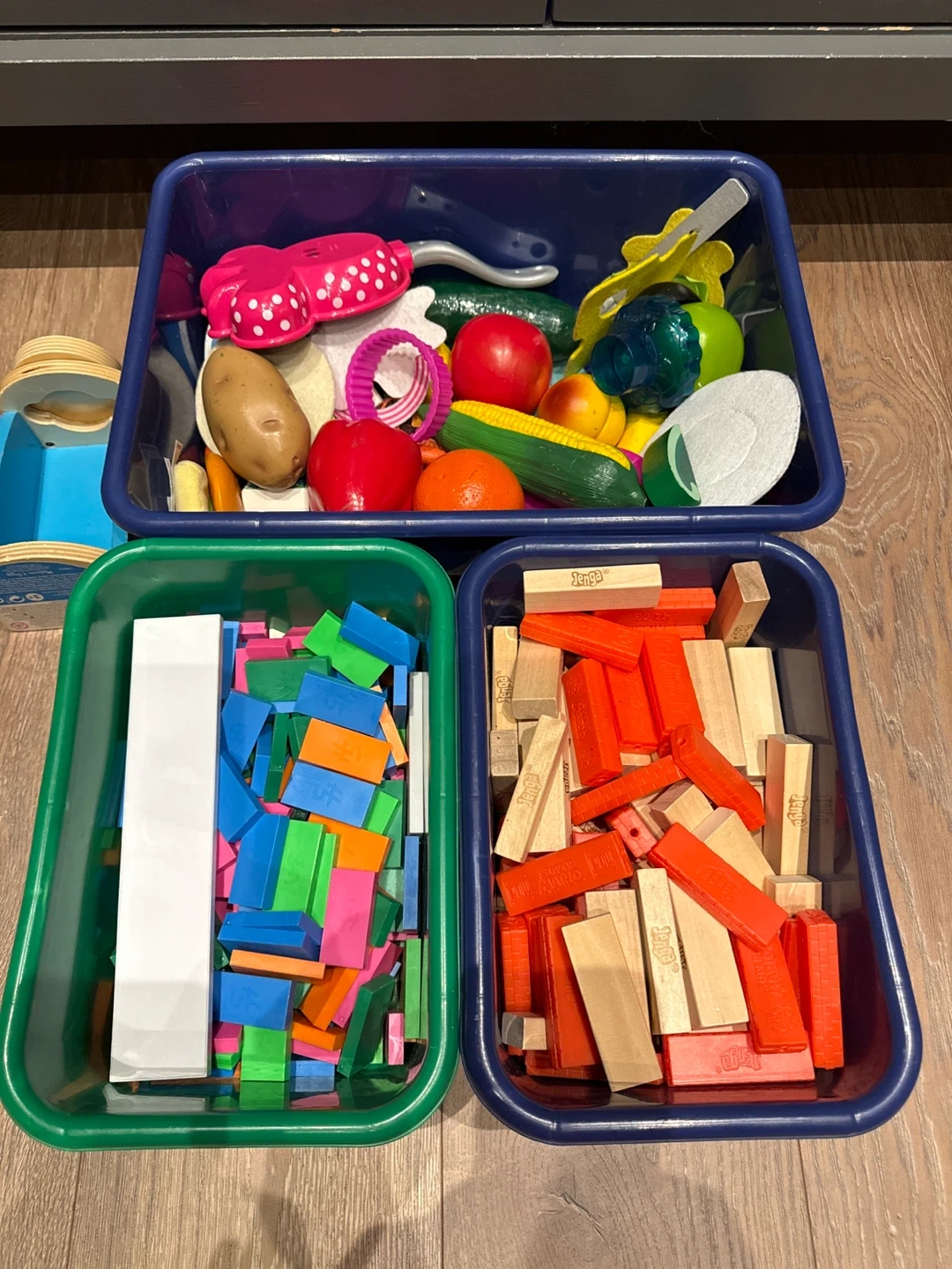 Selling a bin of toy food and two bins of Jenga blocks and dominos. Great for kids who love to play pretend or enjoy building games