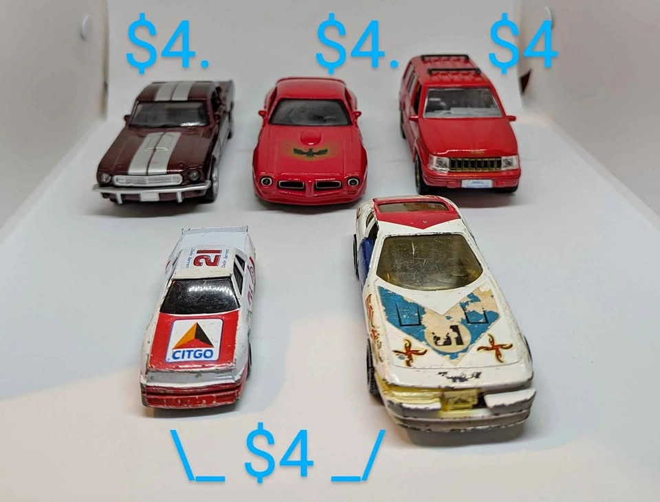 Vintage toy cars! All $10 or $4 ea Starting from Front to back, left to right: ✓ 1991 Citgo 1:64 Racing Champions Nascar Diecast #21 = $4 ✓ Corgi 323 FERRARI DAYTONA 1:36 diecast Vintage Toy = $4 ✓1966 SHELBY GT350, DIECAST, BY NEW-RAY IN 1999, PULLBACK ACTION, 1:32, MAROON = $4 ✓ New Ray Speedy Power 1973 Pontiac Fire Bird Trans Am 1:32 Diecast Pullback Speed = $2 ✓ Jeep Grand Cherokee SS5106 1996 Chrysler Corp. 1/64 . Pullback speed = $2 Pullback speed system still works Used, fair condition Pickup only