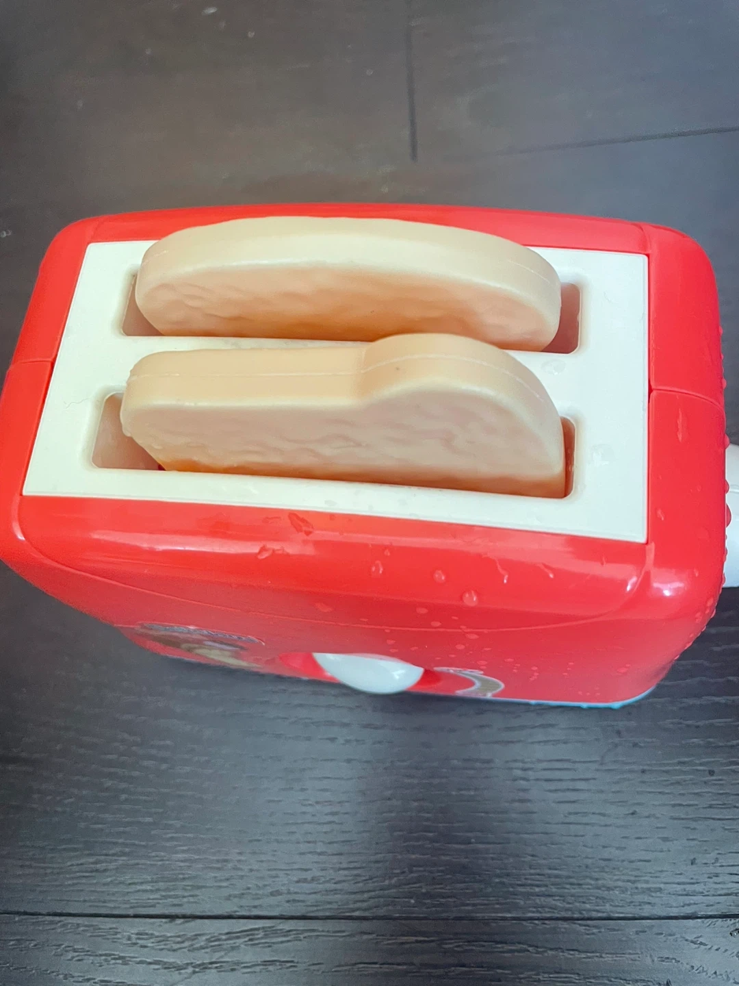 A cute toy toaster with two pieces of toast. Perfect for kids who love playing pretend!