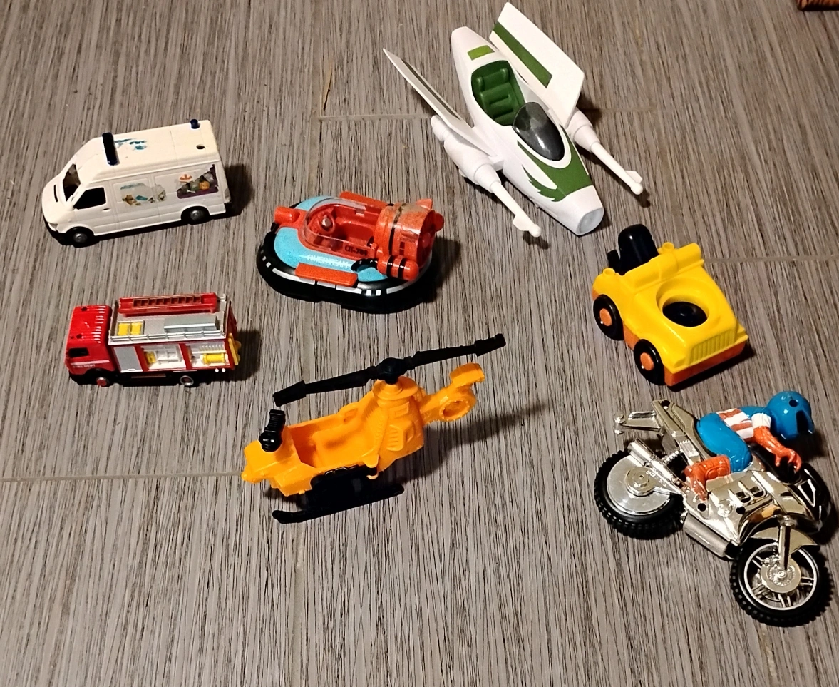 A cool collection of toy vehicles. Comes with a helicopter, motorcycle, and a few other fun vehicles. This bundle is ideal for a child to play with, or to add to their collection, helping them to enjoy a simple pastime.