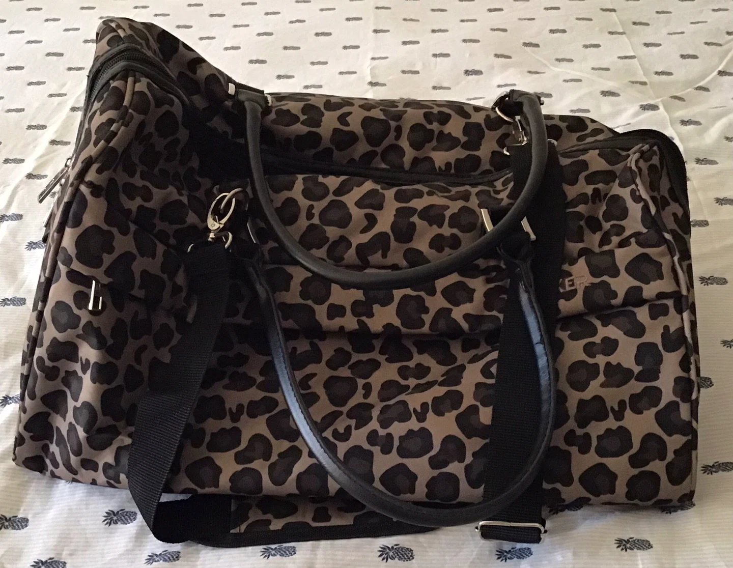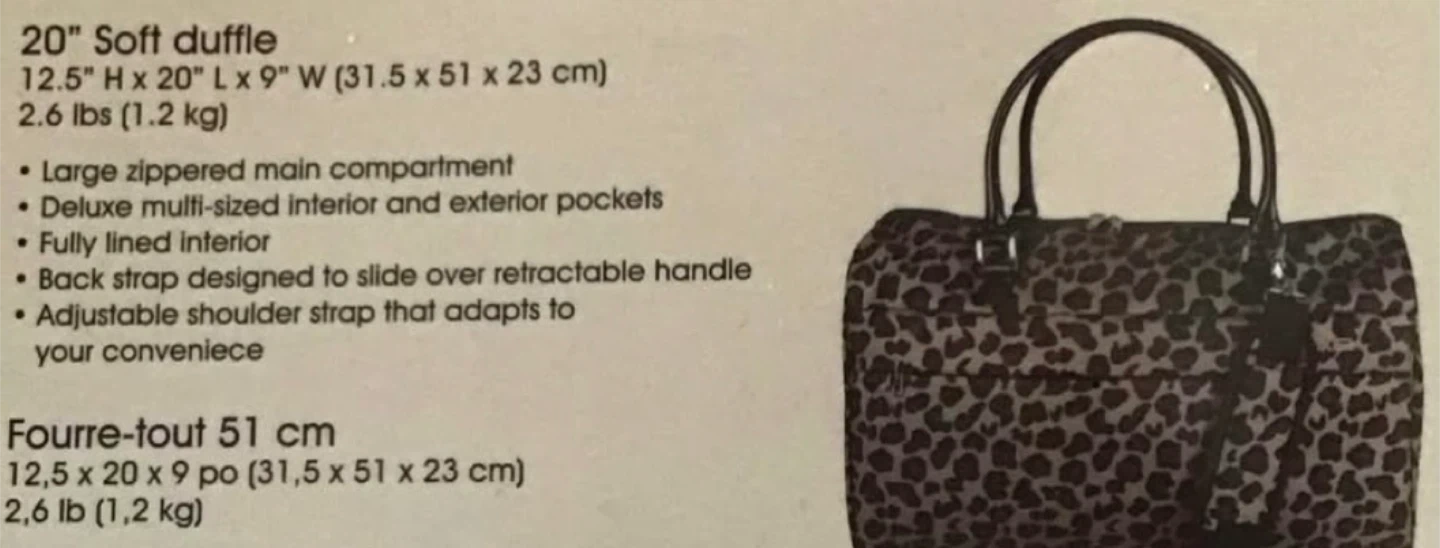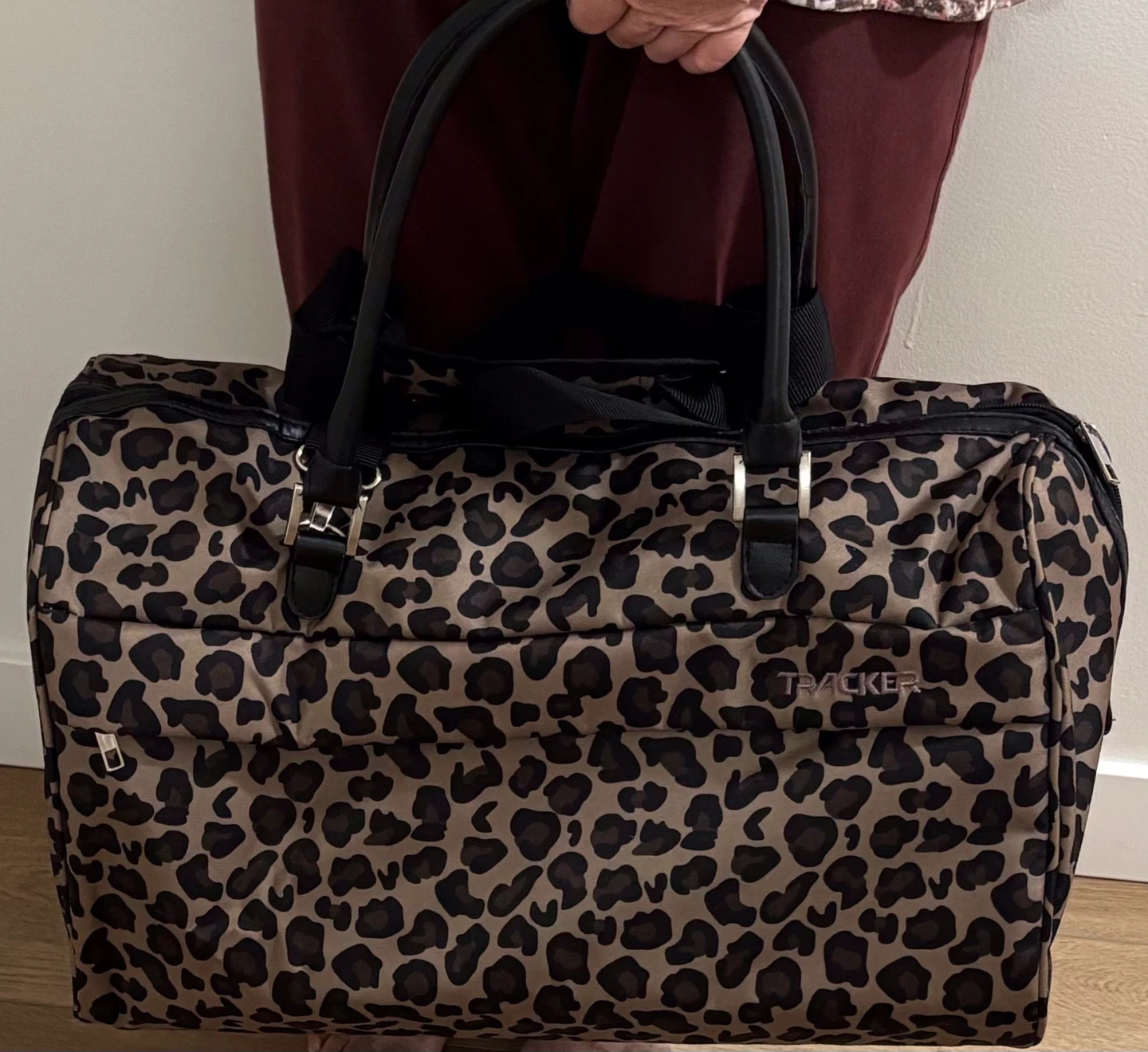 This Tracker 20" soft duffle bag is perfect for your next getaway! It features a stylish leopard print and is in great condition. Key features include: - Large zippered main compartment - Deluxe multi-sized interior and exterior pockets - Fully lined interior - Back strap designed to slide over retractable handle - Adjustable shoulder strap for your convenience Dimensions: 12.5" H x 20" L x 9" W (31.5 x 51 x 23 cm) Weight: 2.6 lbs (1.2 kg) $15.00 exact cash only As is, info in photos Ready for pick up today I have 2 other bags in different listings, 1 is smaller & 1 is larger