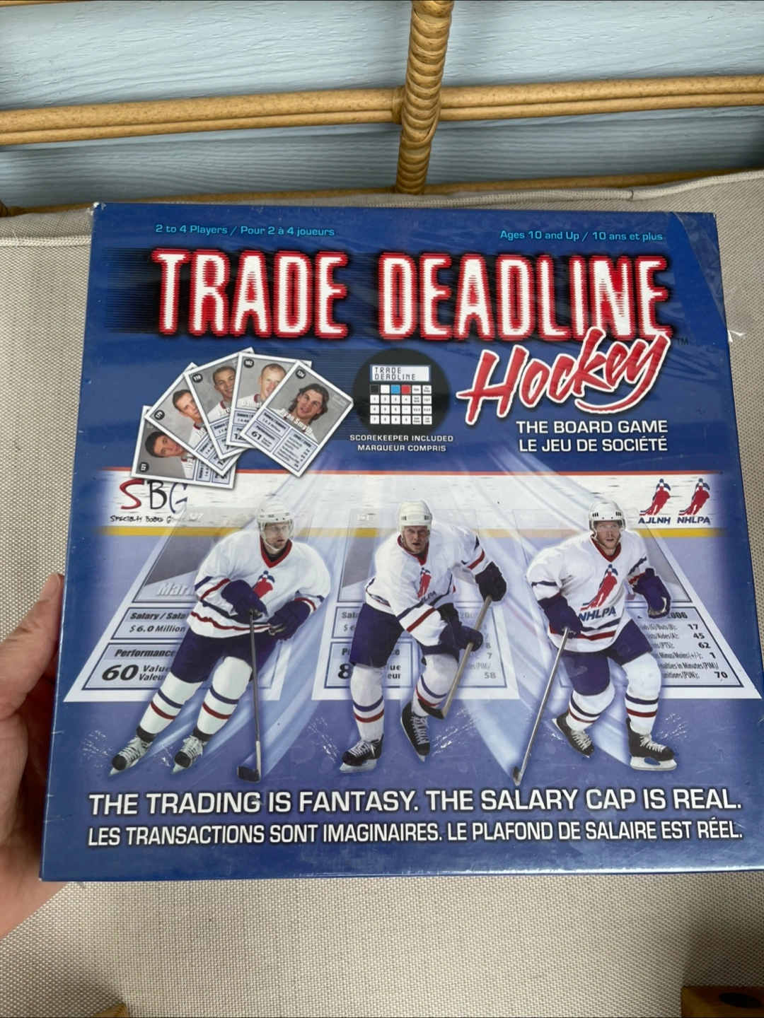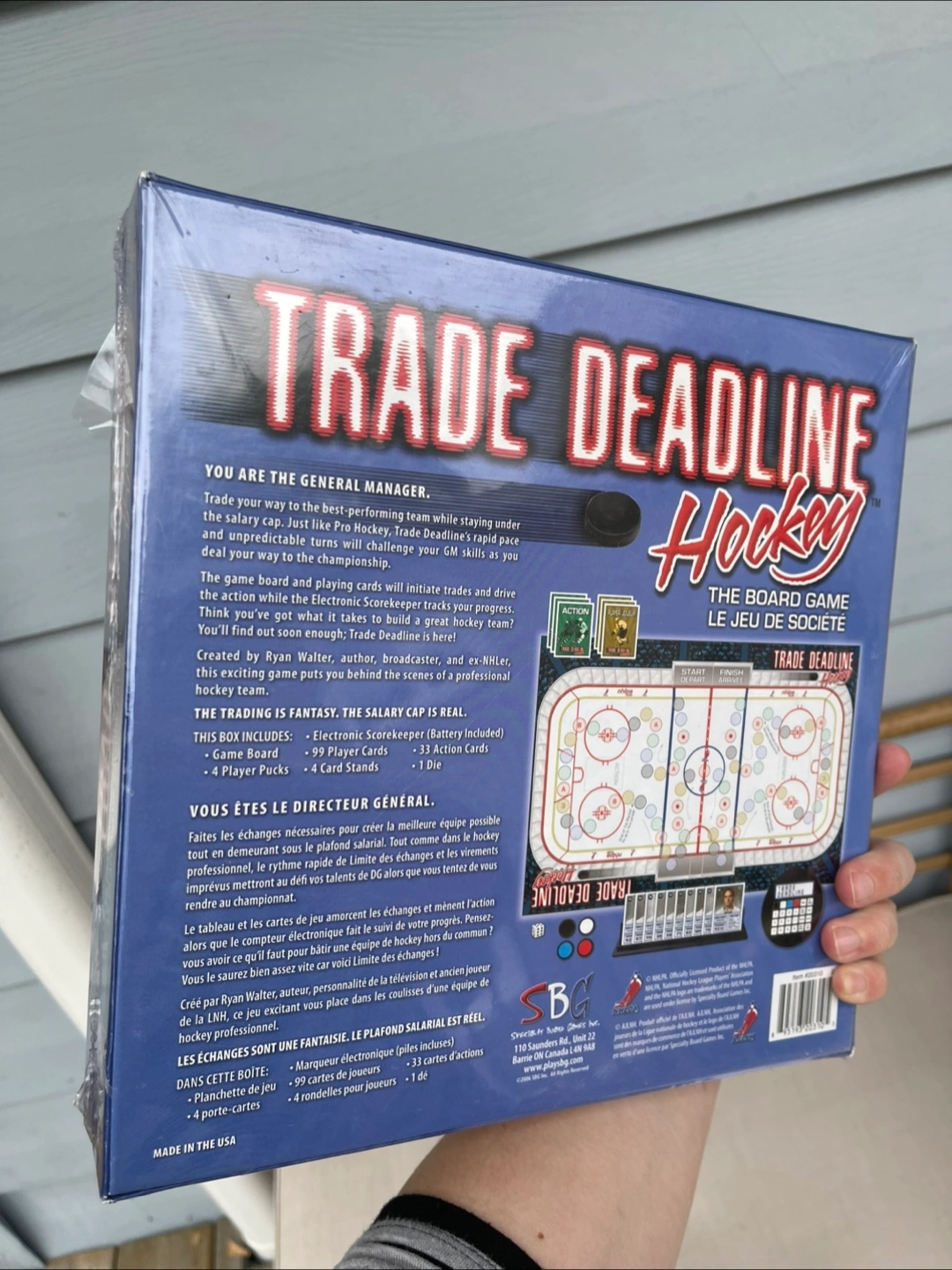 Get ready to manage your own professional hockey team with Trade Deadline Hockey! This board game lets you trade your way to the championship, just like in real life. It includes everything you need to play, including: - Game board - Player cards - Player Pucks - Card stands - Die The game also features an electronic scoreboard to keep track of all the action