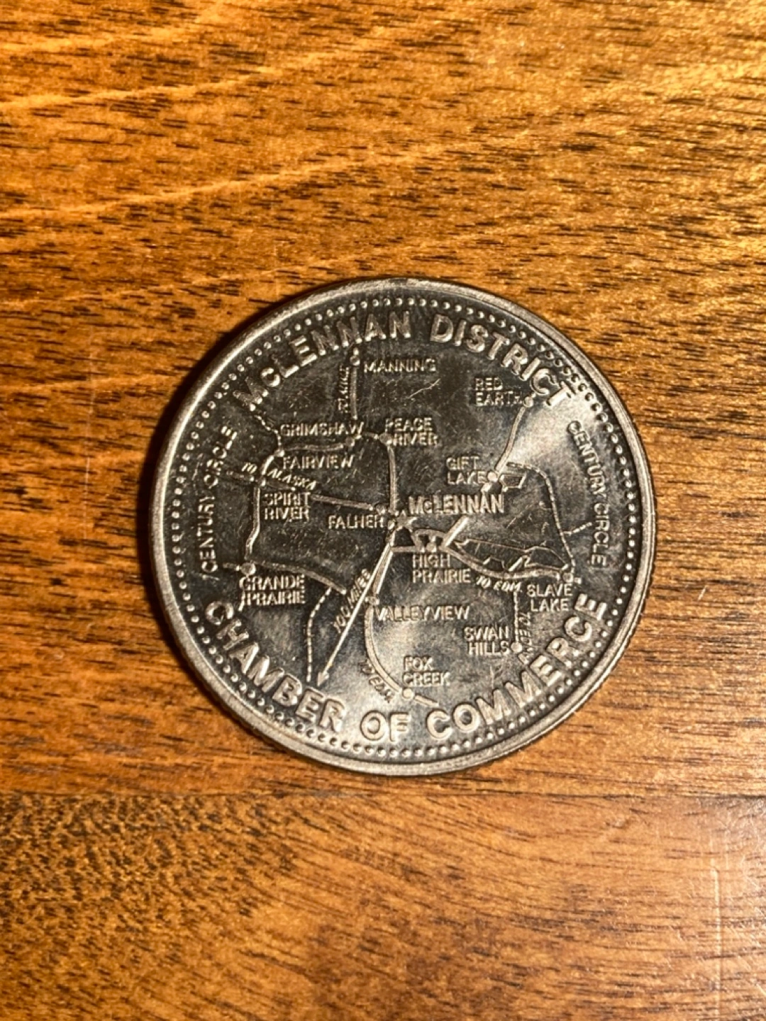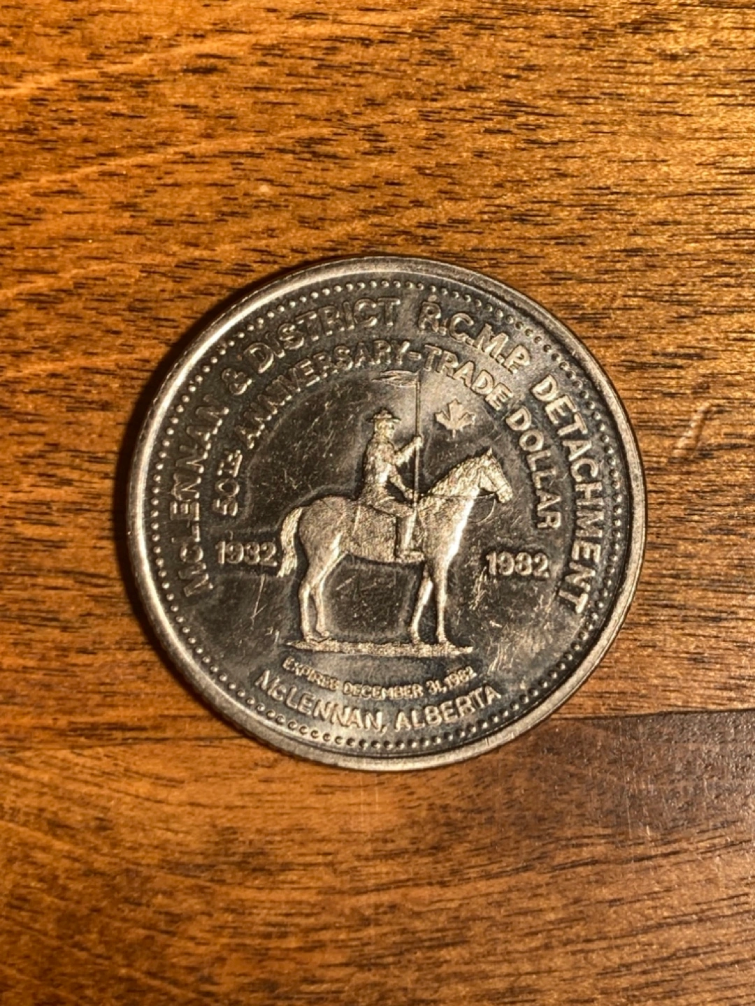McLennan & District RCMP Detachment 50th Anniversary Trade Dollar 1932-1982 McLennan, Alberta Size of a silver dollar coin Have several available Pick up 10 minutes outside Steinbach **Delivery available to Steinbach area & Pembina Valley communities when I am passing through**