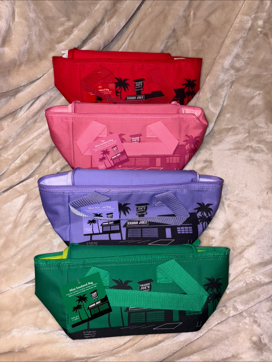 Keep your snacks and drinks cool with these Trader Joe's mini insulated bags! They're perfect for lunches, travel, and outdoor activities. Add an ice pack to help keep foods cold. 20$ each or 2 for 35$ Available stock: 3 pink 2 purple 2 red 1 green