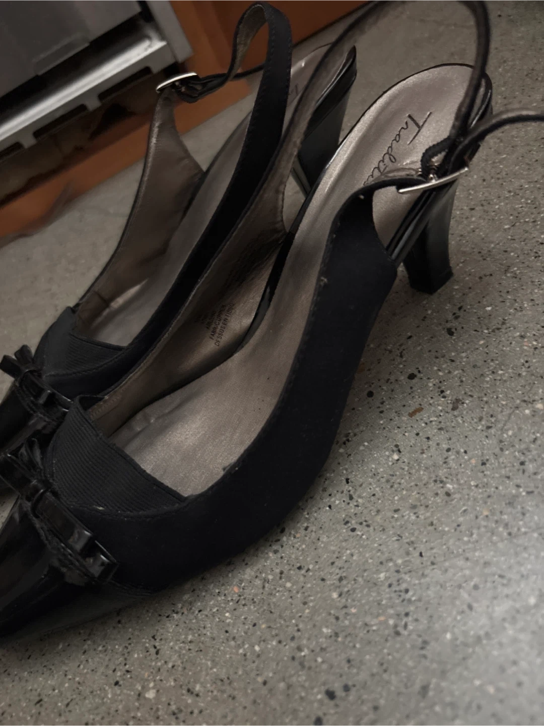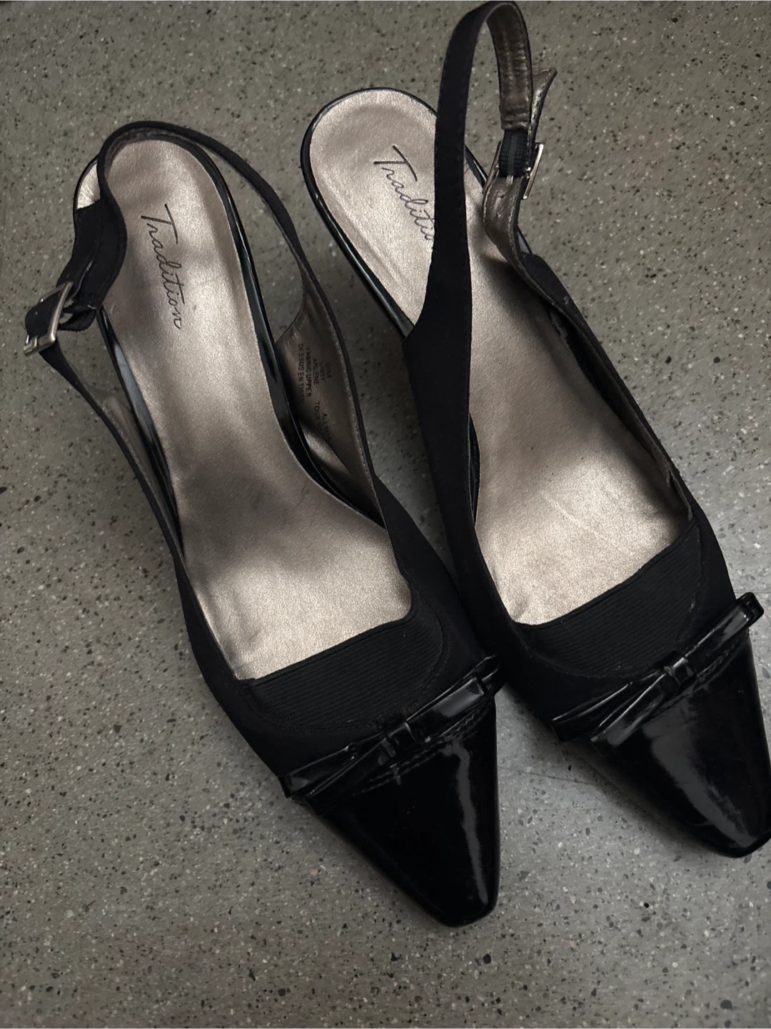 Classic black slingback heels from Tradition, perfect for dressing up or down. These are a size 9 and feature a cute bow detail on the toe. They're in great shape and ready for a new home