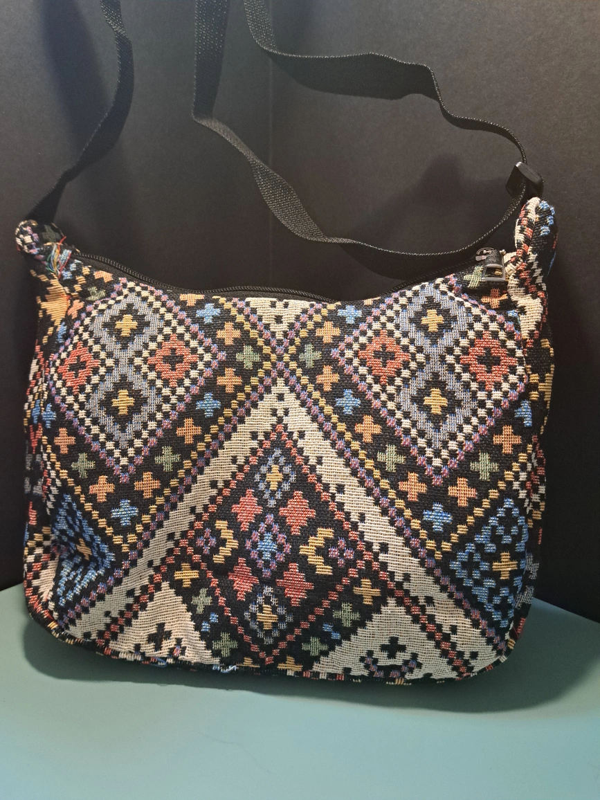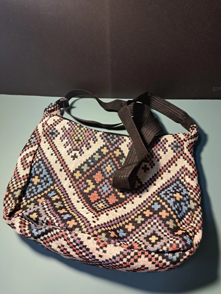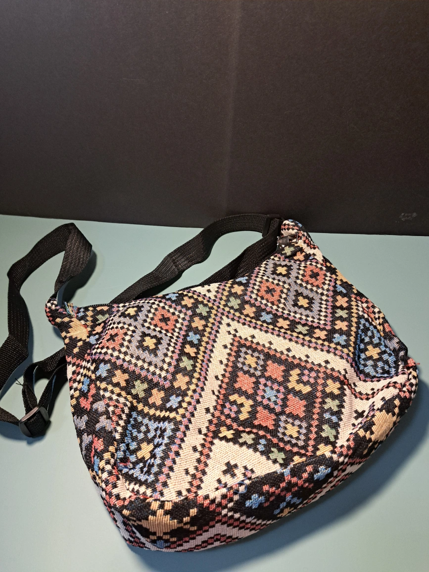 Colorful shoulder bag with a traditional Kilim style pattern with an adjustable strap. If this post is still up, it means the item is available. Size: 9.5" x 10.6" bag and strap is 23.6"