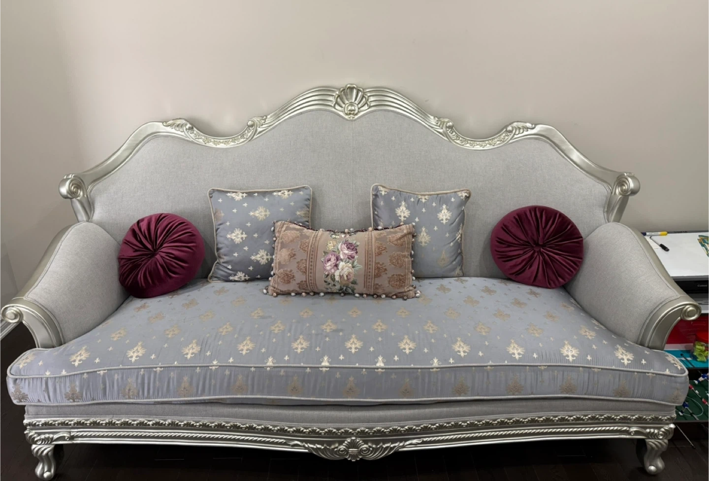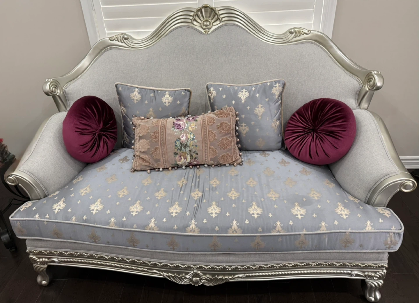 Selling two beautiful traditional sofas with a silver frame and blue patterned upholstery! They come with multiple decorative pillows as pictured and more included. The sofas are in a great condition and would be a lovely addition to any living room or sitting area. They are comfortable and stylish!