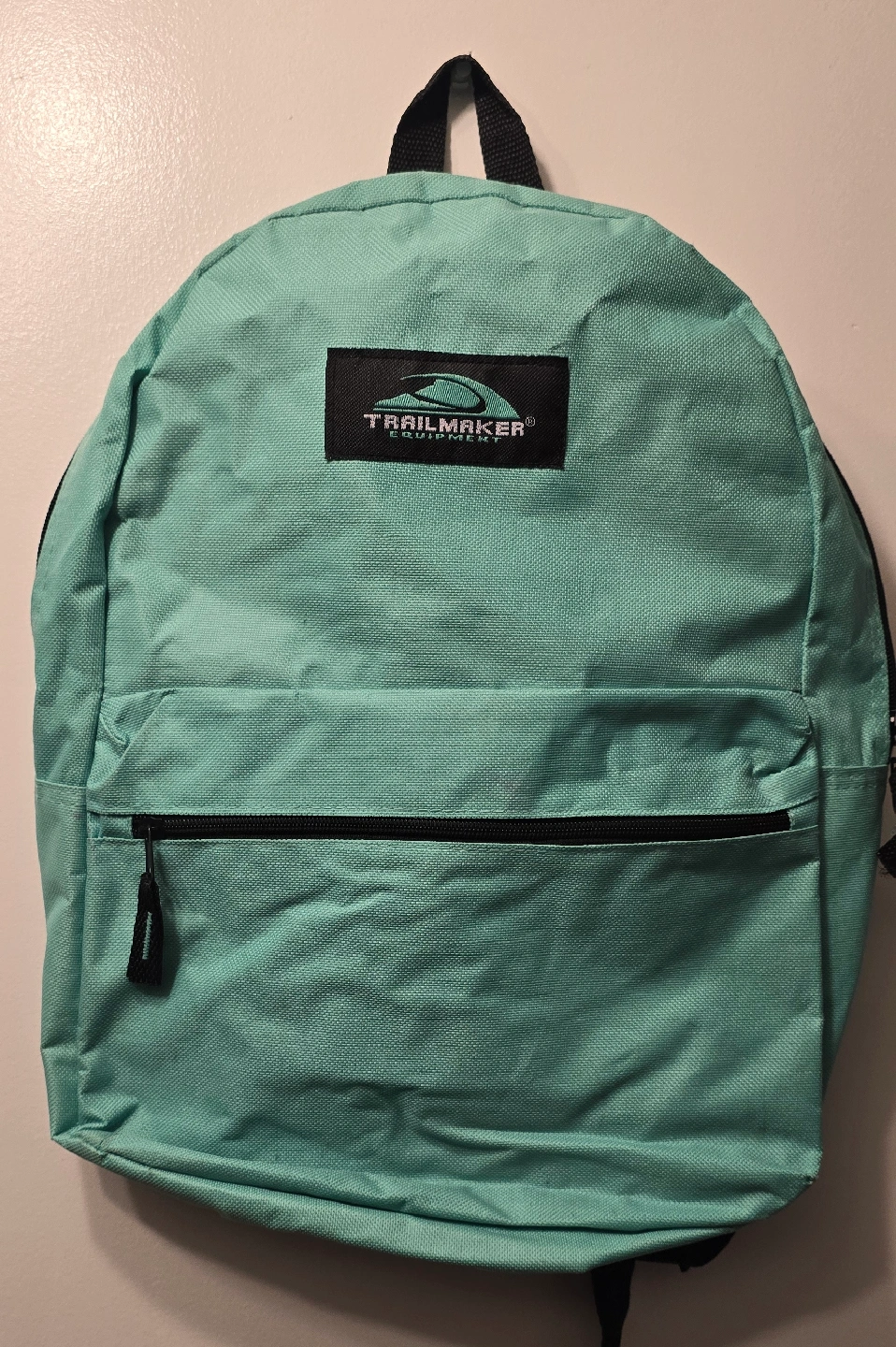 A light green Trailmaker backpack in good condition! Perfect for school, work, or travel. It features a front pocket for easy access to smaller items.