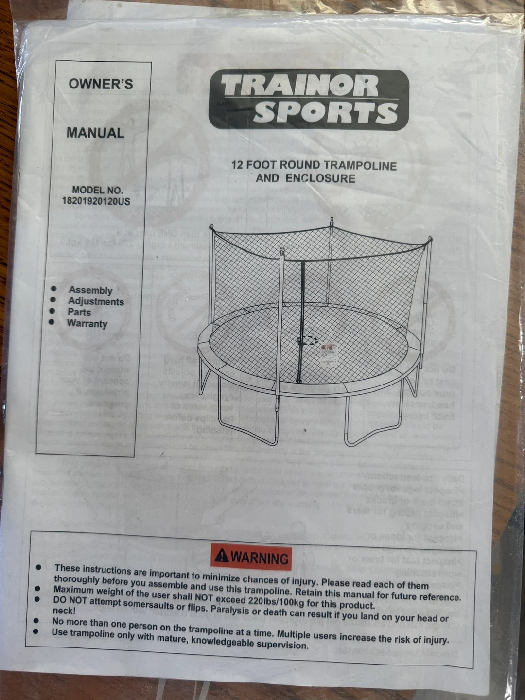 Selling a Trainor Sports 12 foot round trampoline and enclosure. Comes with the owner's manual.