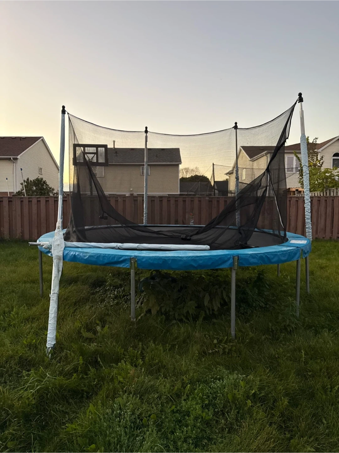 FREE - a trampoline with a safety net! It's in good condition and ready for some fun. Perfect for kids to enjoy the outdoors and get some exercise. The safety net provides added security while bouncing. It also includes a basketball hoop!