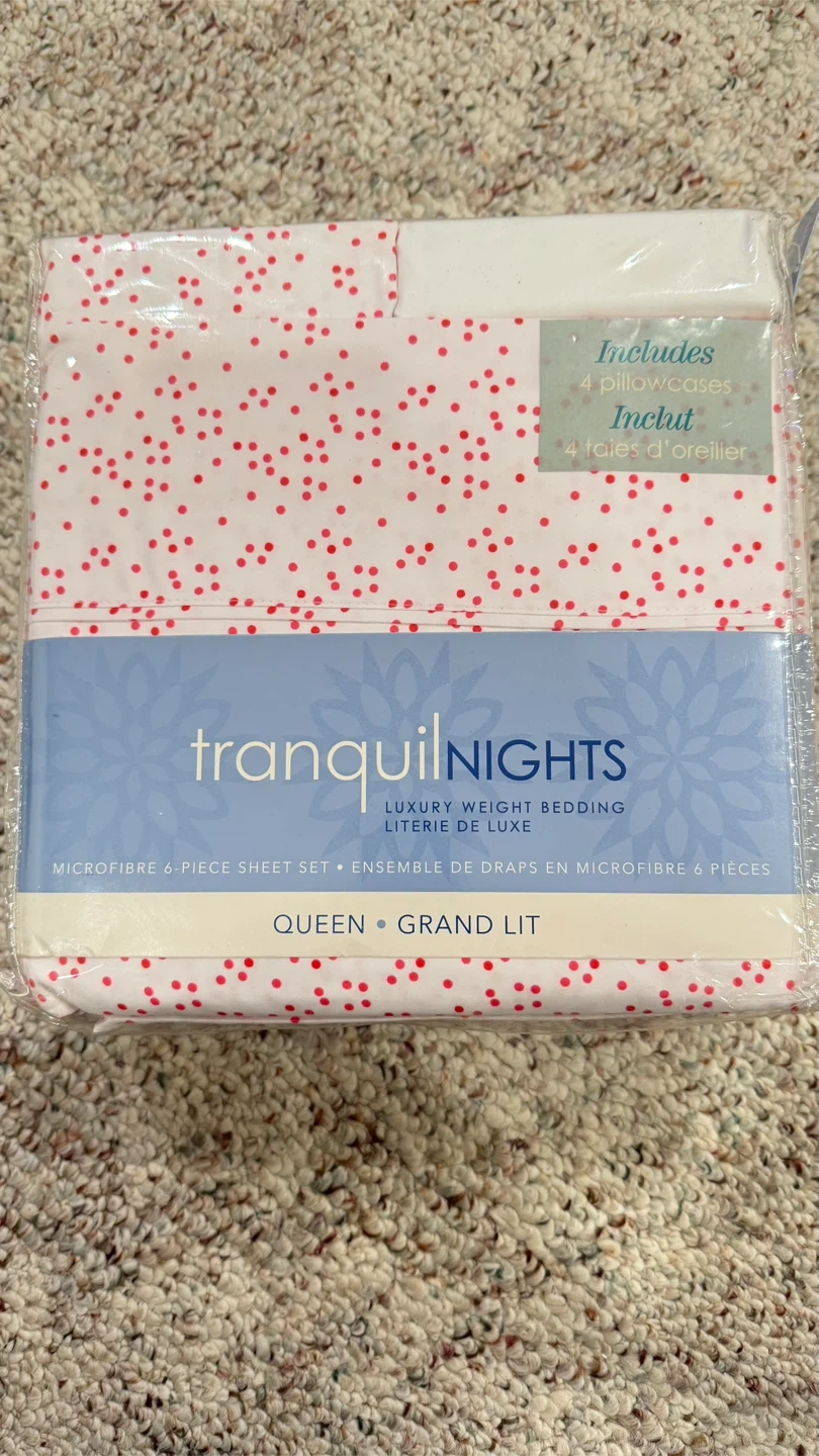 Selling a Tranquil Nights luxury weight bedding set! This is a queen size microfibre 6-piece sheet set. It includes a flat sheet (2.28 m x 2.59 m or 90 in x 102 in), a fitted sheet (1.52 m x 2.03 m + 35 cm or 60 in x 80 in x 14 in), and four pillowcases (53 cm x 81 cm or 21 in x 32 in). Made of 100% polyester and machine washable