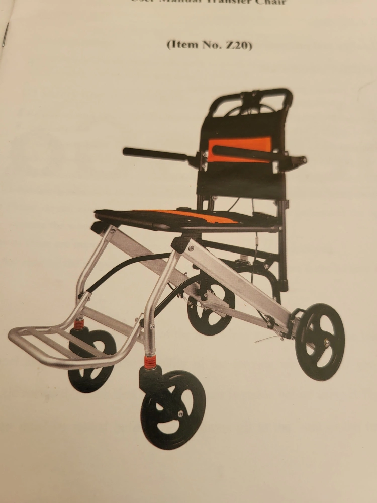 Transfer Chair. Great for anyone needing a portable and easy-to-use transfer chair. It's foldable, wheels brake, and. feet rest. It is handy and compact, very useful during flight travel.