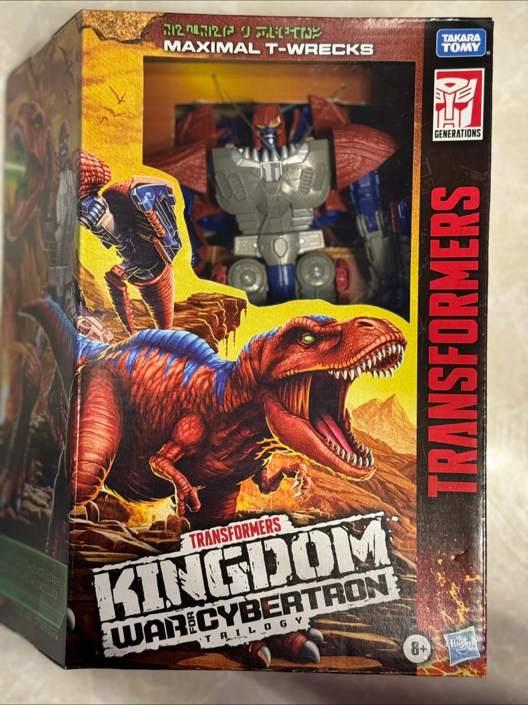 Selling a Transformers Kingdom War for Cybertron Trilogy Leader Class Maximal T-Wrecks figure. The box is in great shape and suitable for ages 8+