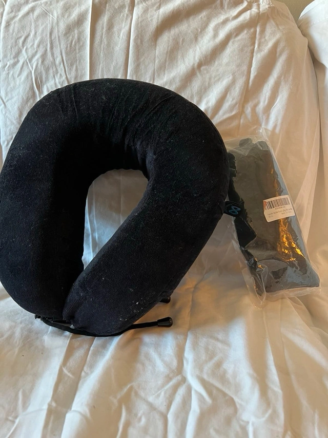 This travel bundle includes a comfortable, black, memory foam neck pillow and a convenient hanging foot rest, both designed to enhance comfort during travel. The neck pillow has a soft, plush cover and adjustable drawstring, providing excellent support, and the footrest is easily portable and adjustable. The neck pillow is used, but in good condition, showing only minor signs of wear, ready for your next journey. * Memory foam neck pillow w carrying bag to condense it and keep it clean * Adjustable drawstring * Hanging foot rest * Portable design I'm selling this travel bundle for $20. If the ad is still up, yes, it's still available!