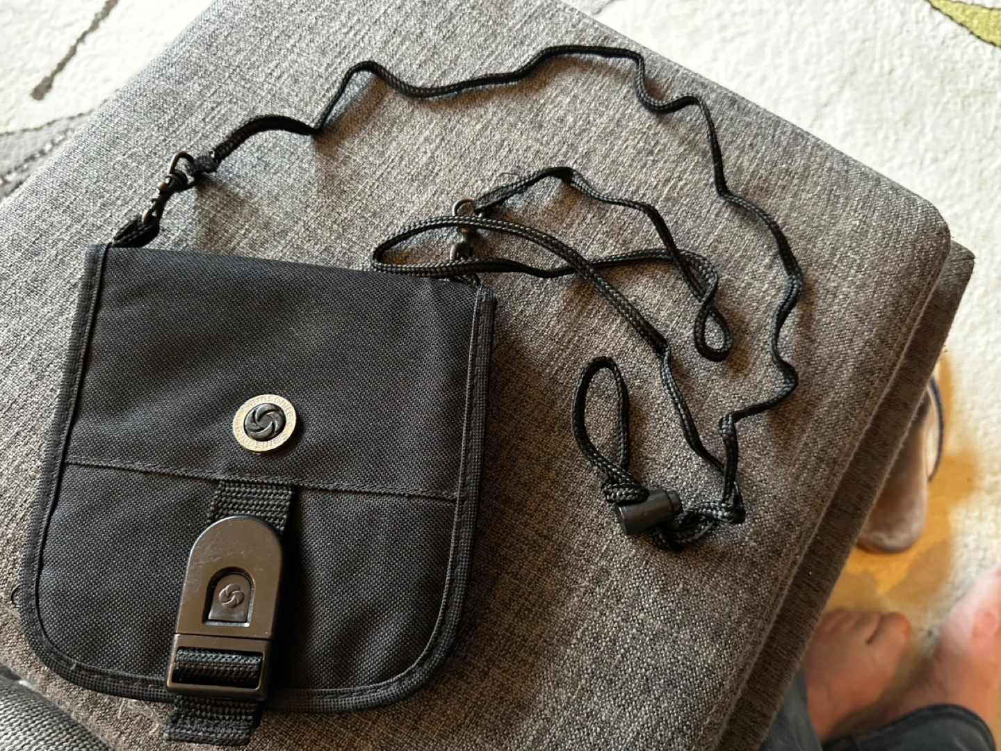 Black, cloth travel wallet. Multiple zippered compartments. Includes a shoulder strap. Great for travel or everyday use. #Thriftypicks