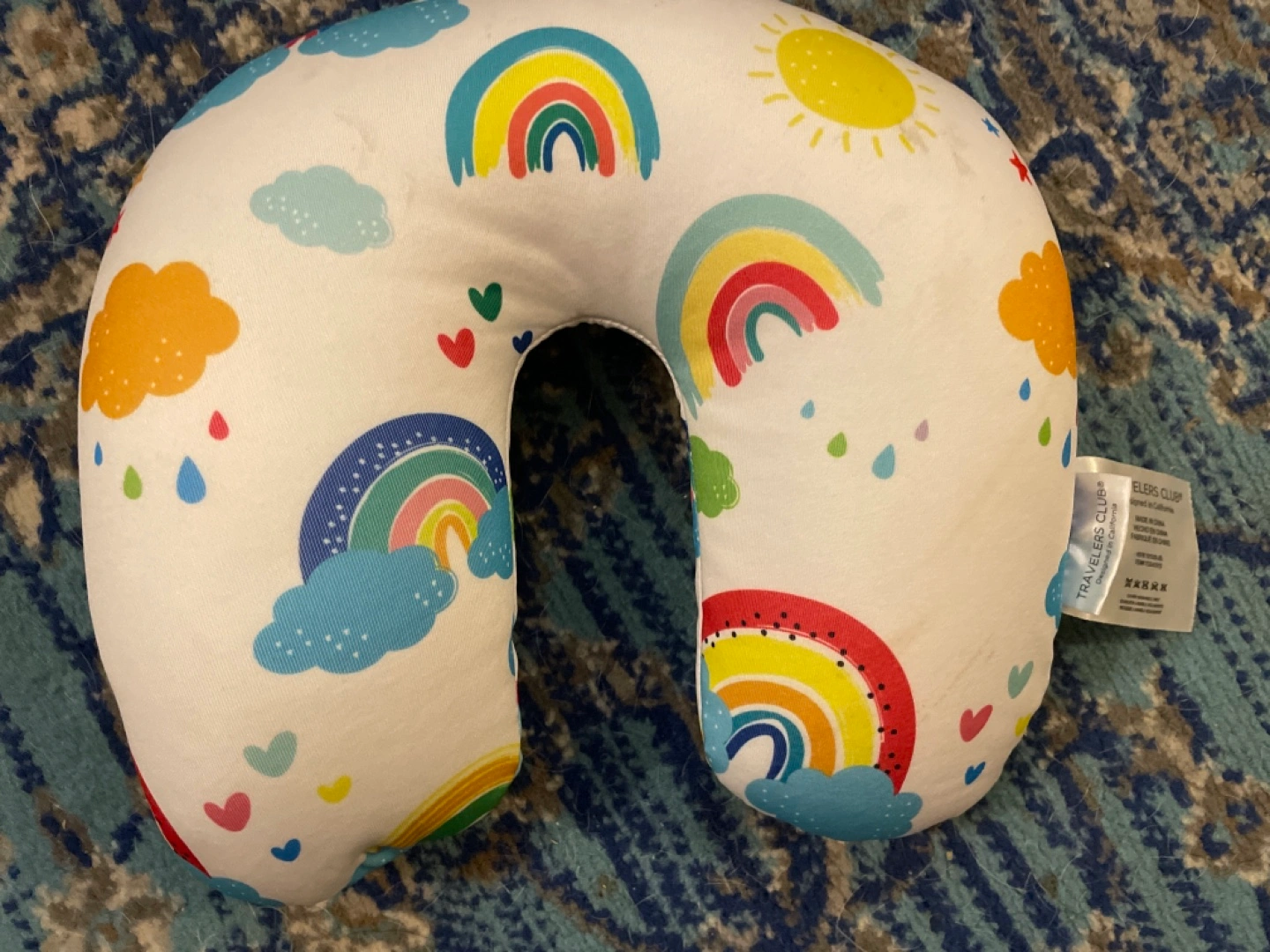Show allHere's a cute neck pillow from Travelers Club for kids! It features a colourful rainbow, cloud, and sun print. It's perfect for travel or just relaxing at home