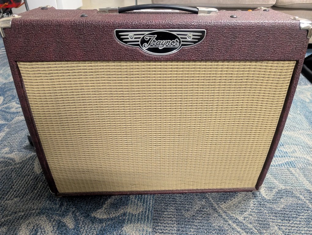 Traynor YCV40 with Vintage30 speaker, this particular speaker is better for live environments as it's very rich. Amp is in fantastic condition. Reverb tank is absent but a Electro-Harmonix Holy Grail Neo is included as a substitute, with FX loop cables included. Amp pedal amd cover included also. 40w 1x12" Fully Tubed Amp
