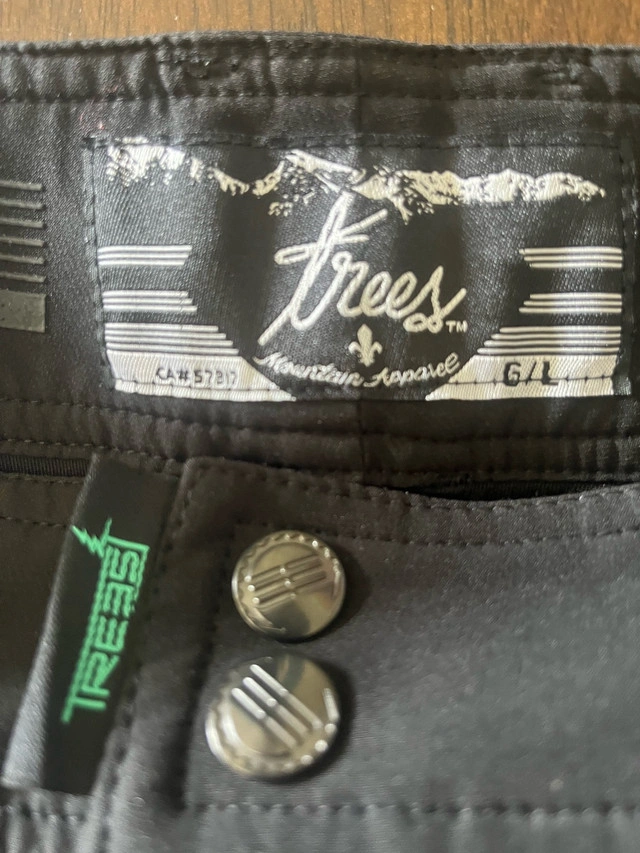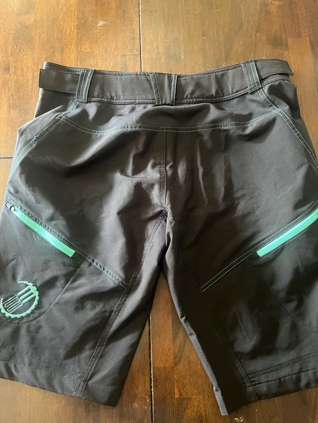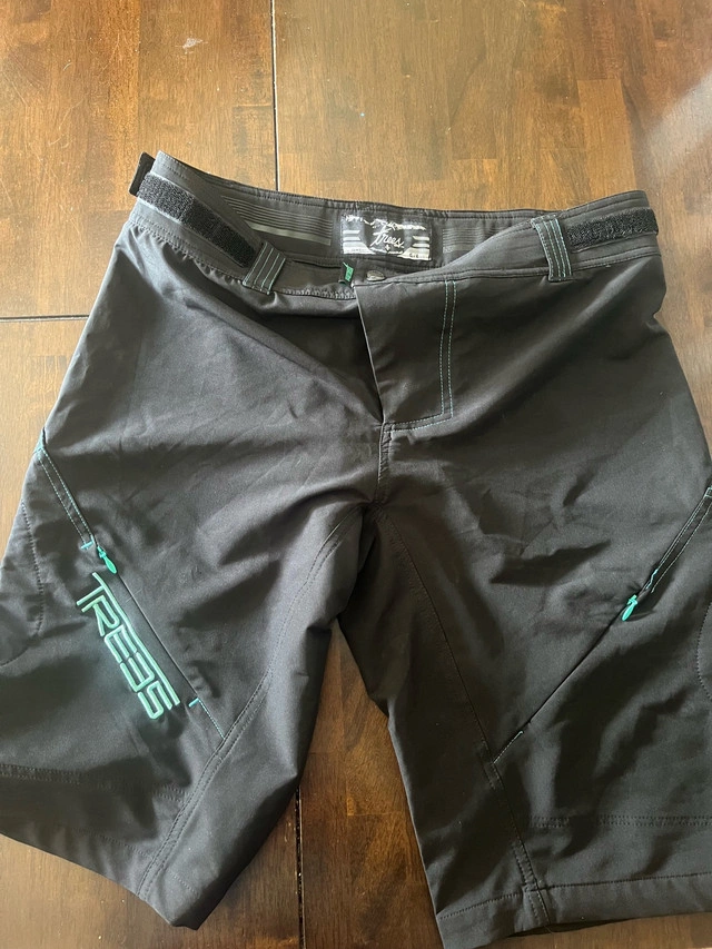 Get ready to hit the trails with these Trees Mountain Apparel mountain bike shorts. These shorts are a size large, made of durable, flexible material, and are in good condition. They have convenient zipper pockets for secure storage. Key Features: * Size: Large * Colour: Black with turquoise accents * Material: Durable, flexible fabric * Pockets: Zippered side pockets for secure storage * Adjustable waist These shorts are ideal for mountain biking, offering comfort and functionality for your outdoor adventures.