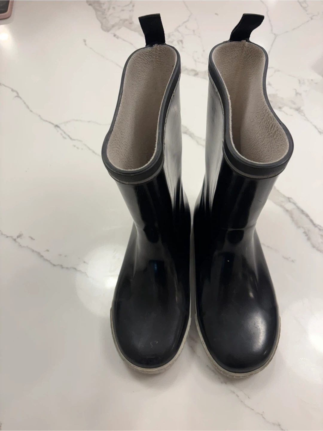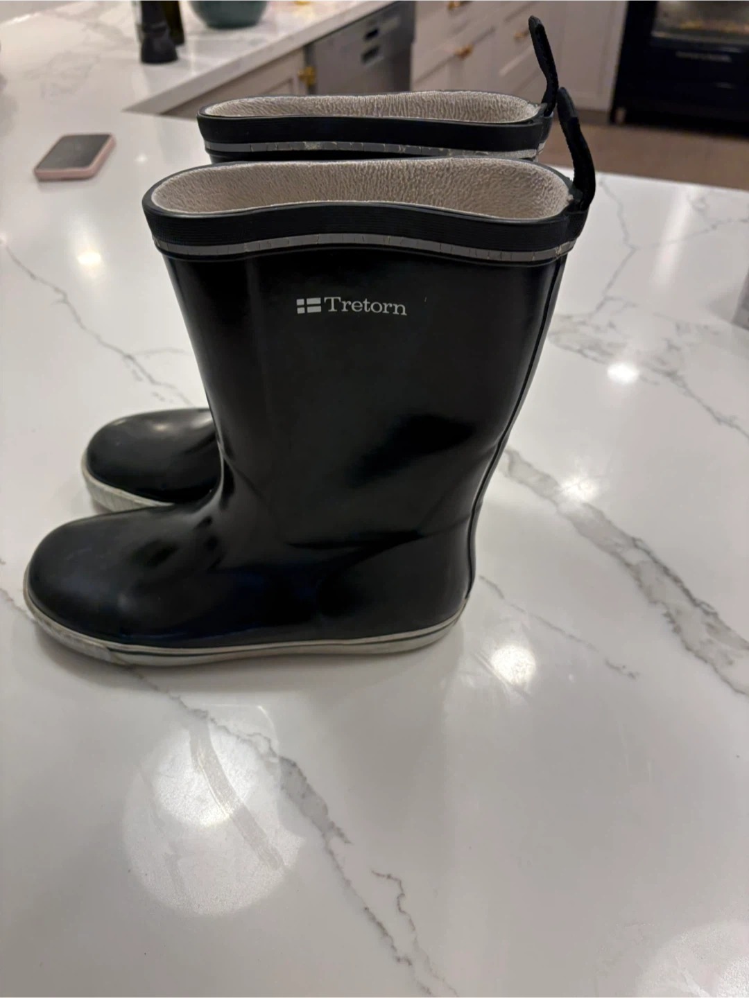 These are a pair of Tretorn rain boots in black. They are perfect for rainy days to keep your feet dry and stylish! They are in good condition and ready for a new home