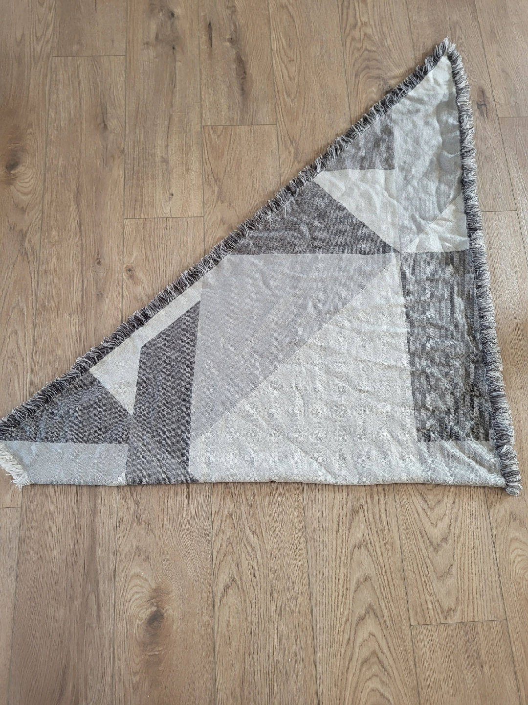 Selling a cozy triangle scarf in shades of grey and white! It has a geometric pattern and fringed edges. Perfect for adding a touch of warmth and style to your fall outfit!
