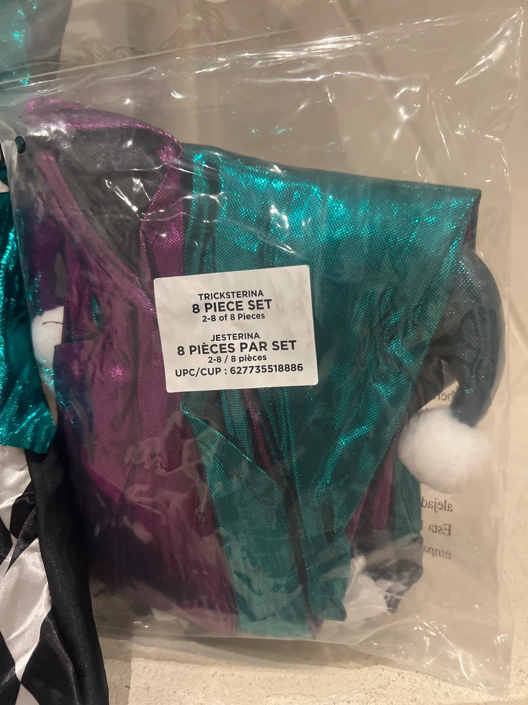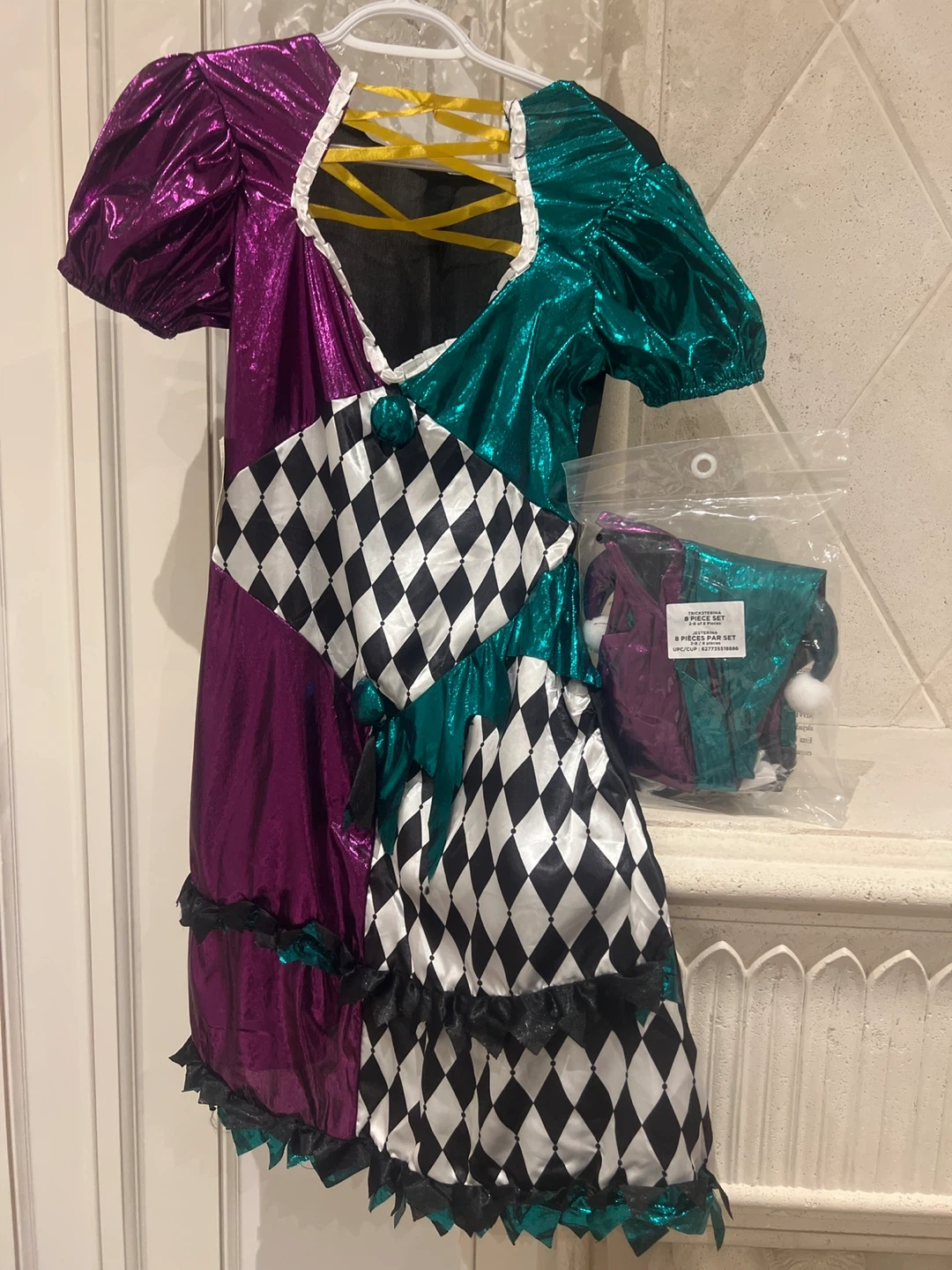 Selling a brand new Tricksterina Jesterina 8-piece costume set! It includes a headband, mask, collar, dress, gloves, and leg covers. This fun costume retails for $25.98 and is perfect for dress-up or Halloween