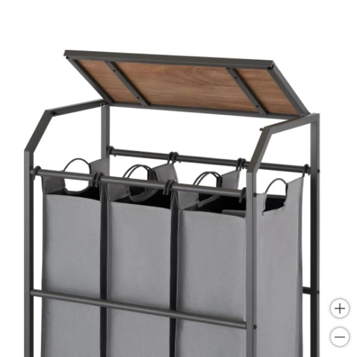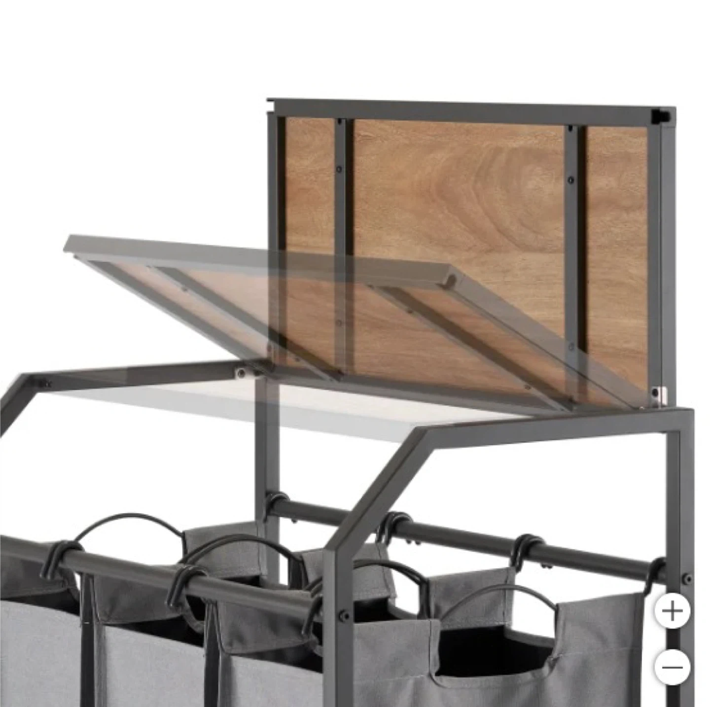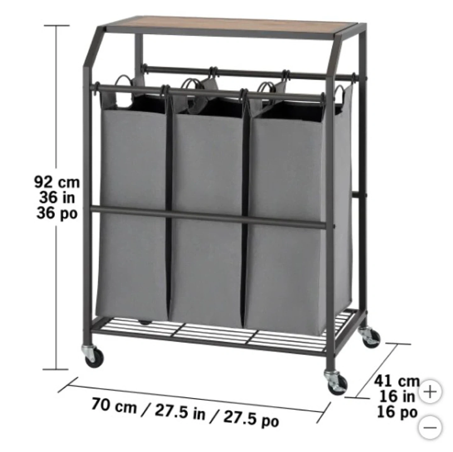 Trinity 3-bag Laundry Cart with Flip Top *already assembled* Used for a year. Still in great condition except one of the screws came loose on the flip top and we just haven't gotten around to fixing it. Doesn't affect performance. Trinity’s 3-bag laundry sorter on wheels features a slow-close oak-colored flip-top that rotates upwards to a 90-degree angle. This functional detail allows one ease of use as it seamlessly transitions from a workspace for folding to a sorting-only mode. The rolling laundry cart would make a great addition to any traditional wash room or closet setting, but its sleek design would also be suitable for the bedroom or bathroom itself. The sturdy, deep bags are large enough to accommodate many items of clothing, and they also feature handles to allow for easy mobility of the bags themselves. Features: Flip-top work surface Slow-close top MDF with oak brown color Powder-coated dark gray 100% Polyester bags: durable, stain resistant, mold resistant Removable polyester laundry bags Includes: 1 x Flip-top shelf 3 x Laundry bags 1 x Bottom shelf 4 x Poles 2 x Locking wheels 2 x Non-locking wheels 6 x Bag handles Specifications: Overall Height: 91.44 cm (36 in) Overall Width: 69.85 cm (27.5 in) Overall Depth: 40.64 cm (16 in) Overall assembled weight: 7.94 kg (17.7lb)