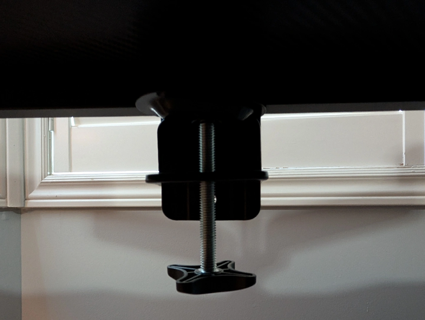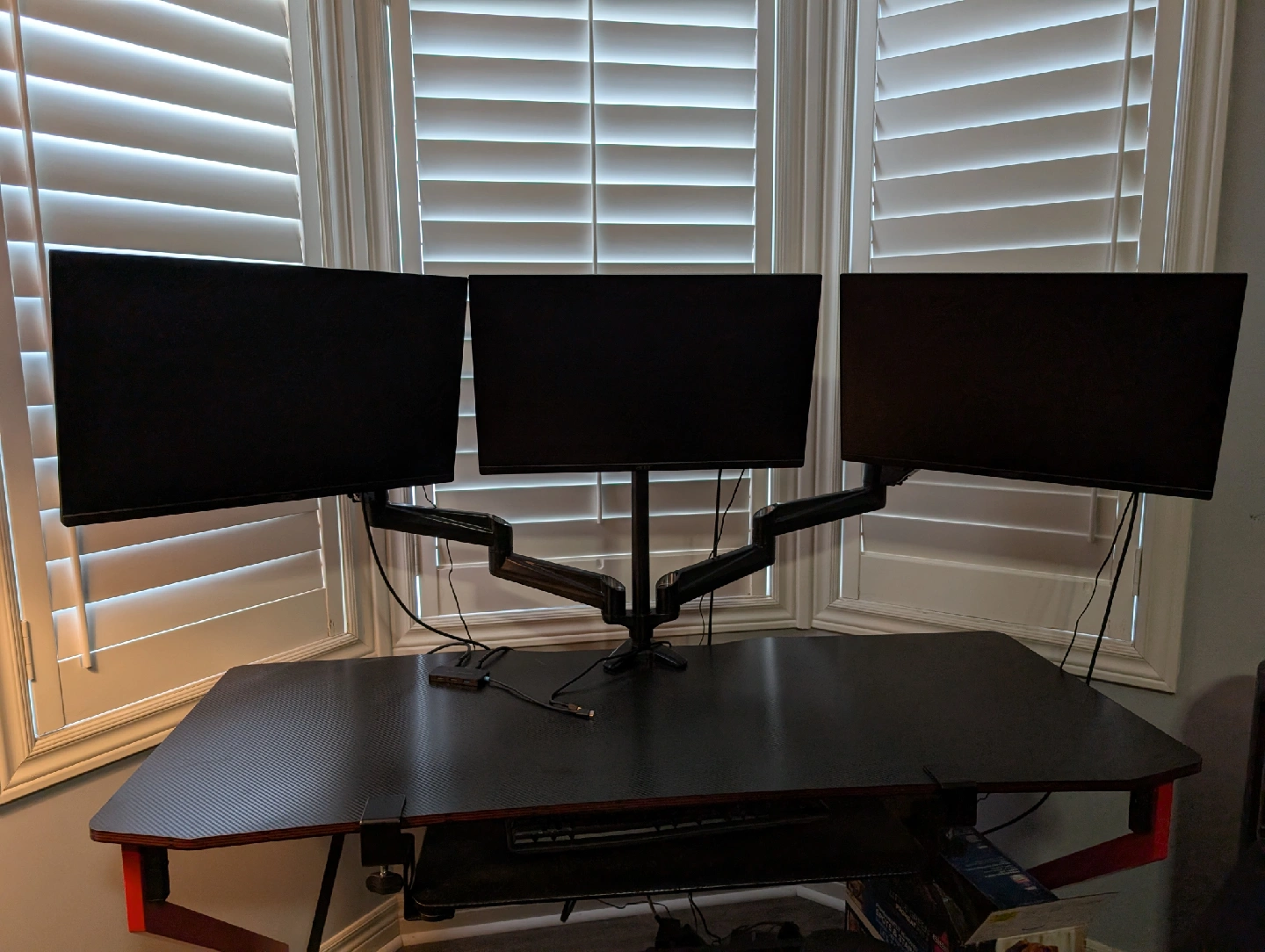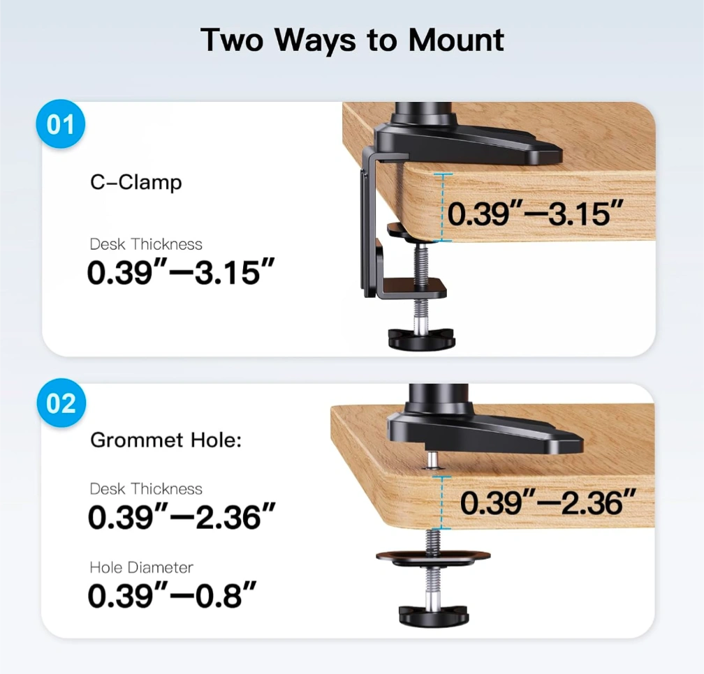 Selling a triple monitor desk mount! It's in great condition and ready to help you optimize your workspace. It can be mounted two ways: C-clamp or Grommet Hole. Desk thickness supported: 0.39"-3.15".