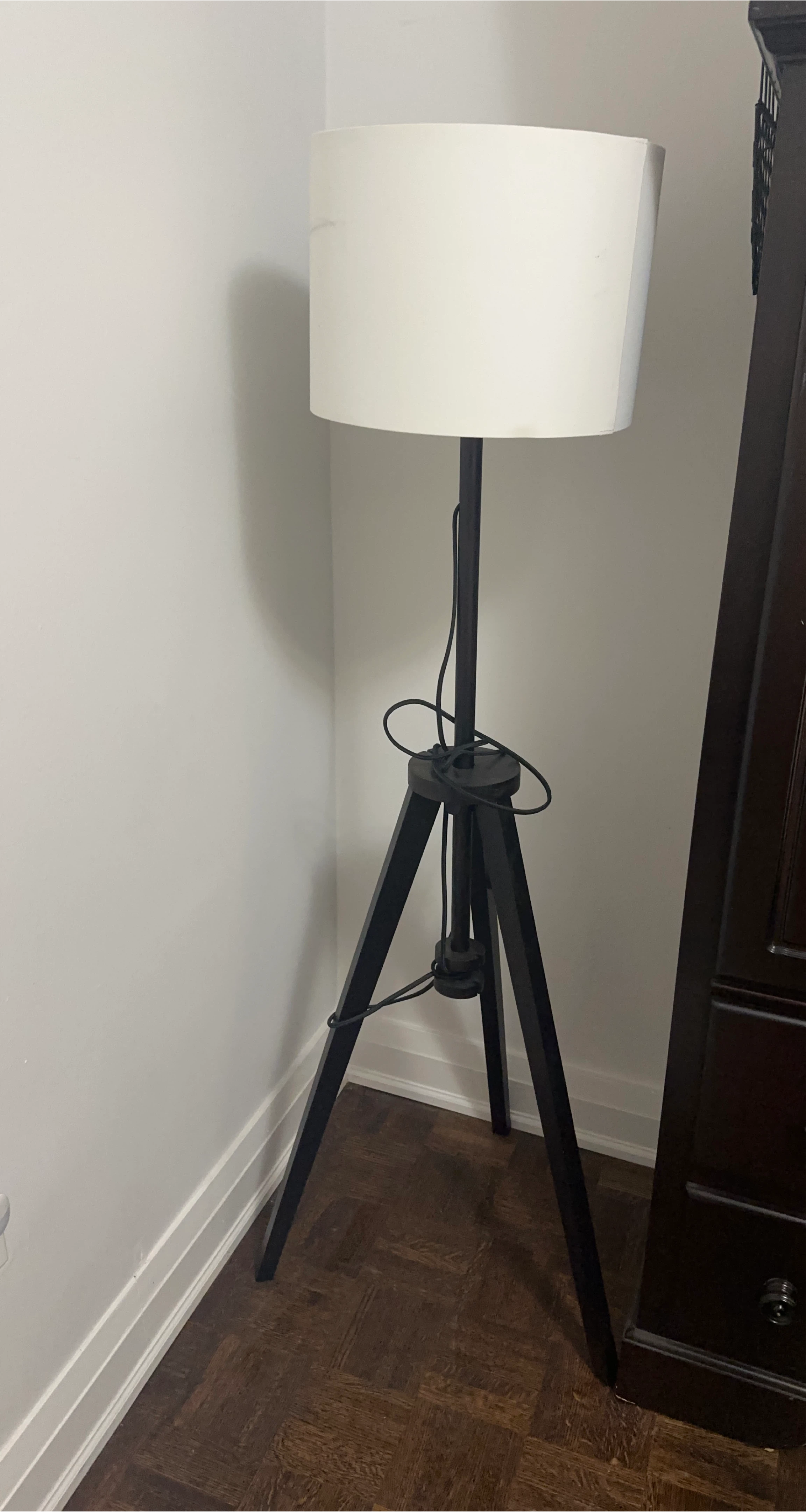 Selling a tripod floor lamp with a black frame and white shade. It's in great shape and would look great in any room! Perfect for adding some extra light to your space